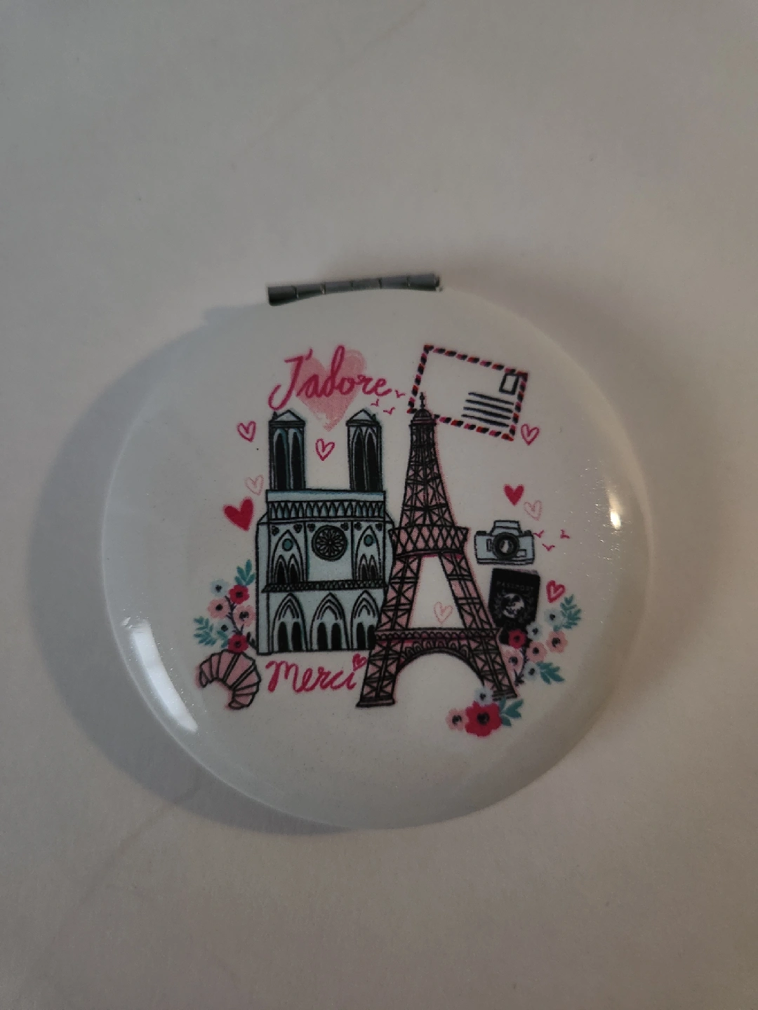 75Cute compact mirror with a Paris theme! It features the Eiffel Tower, Notre Dame, and says 'J'adore' and 'Merci'