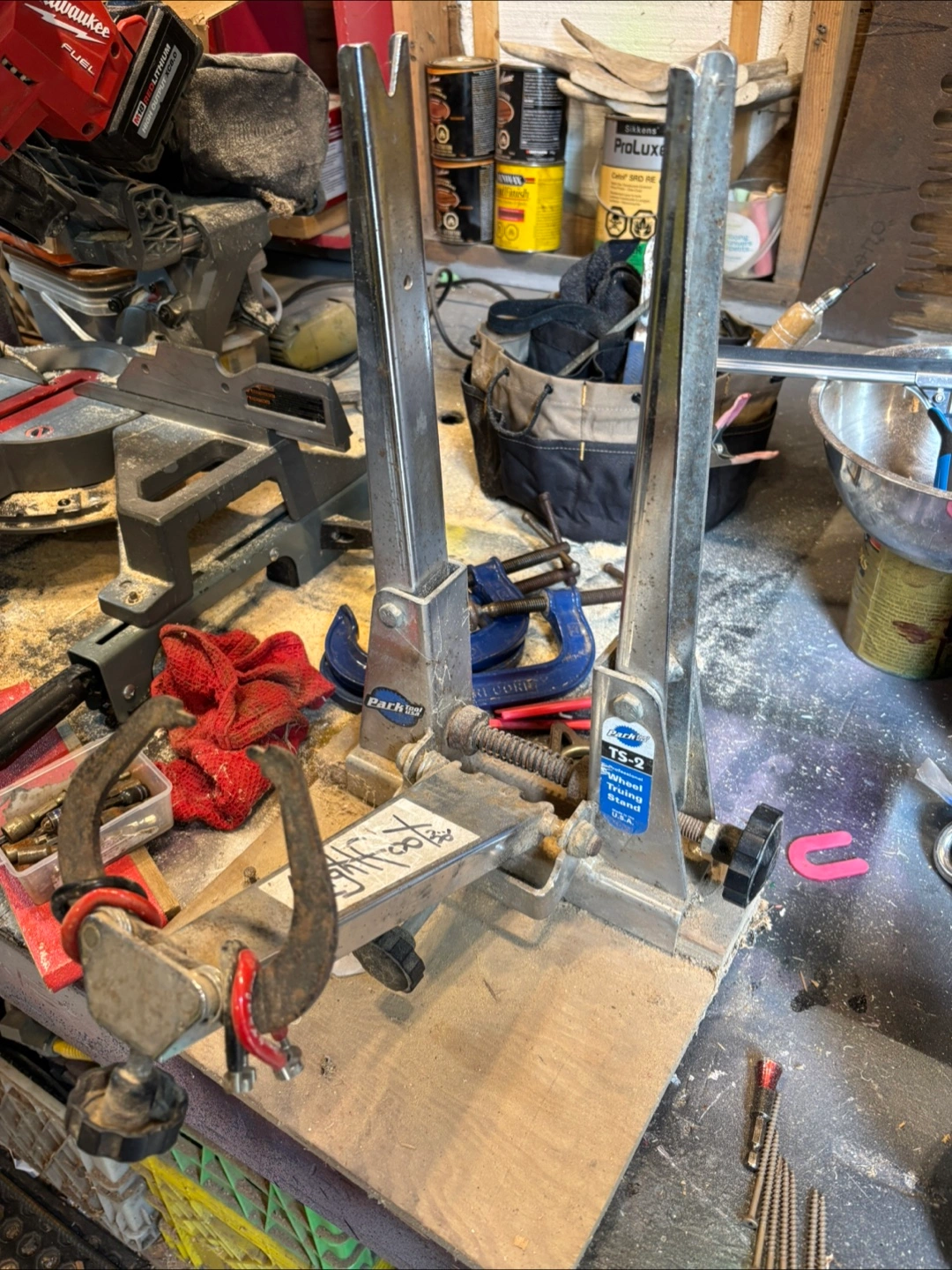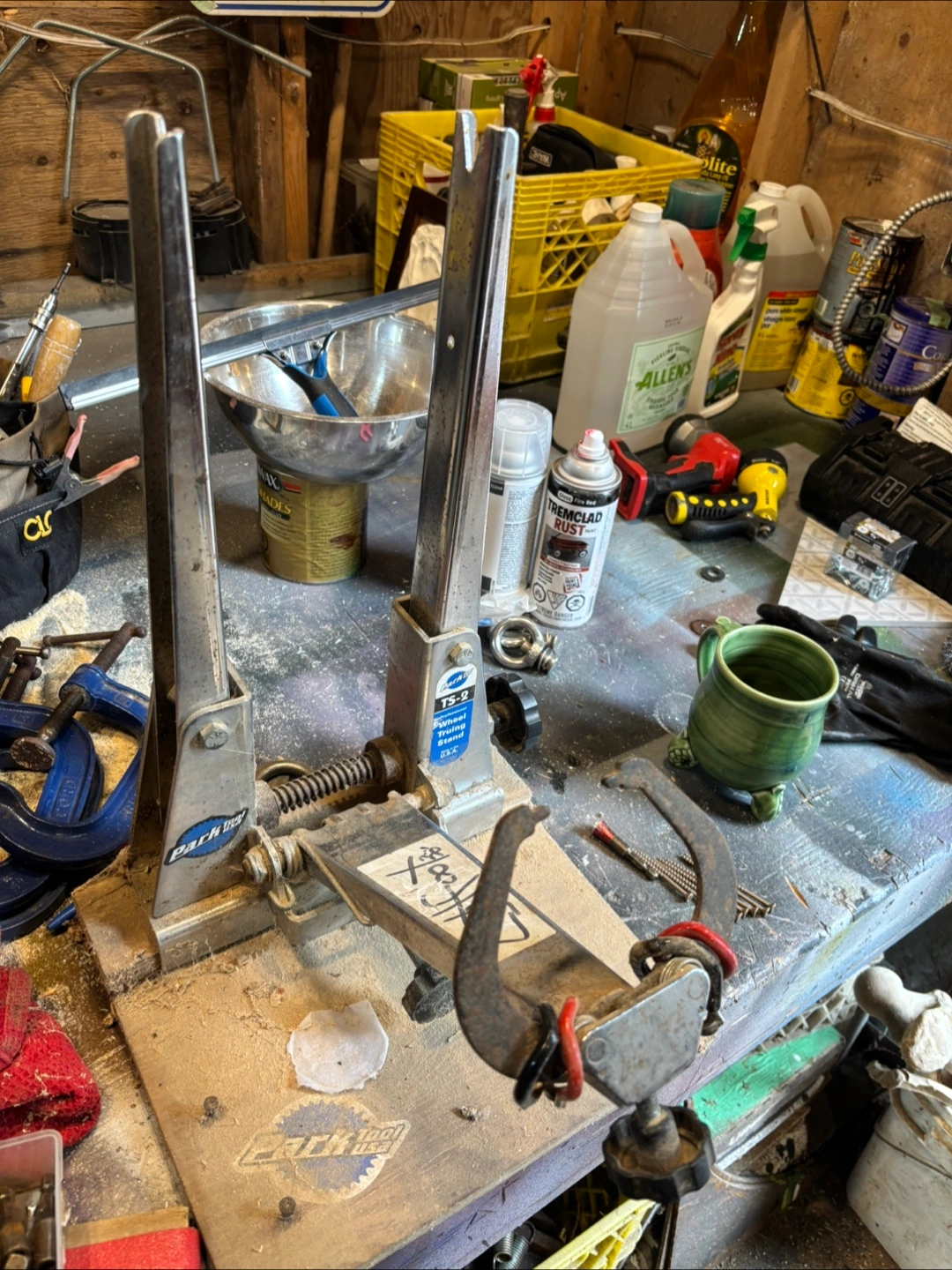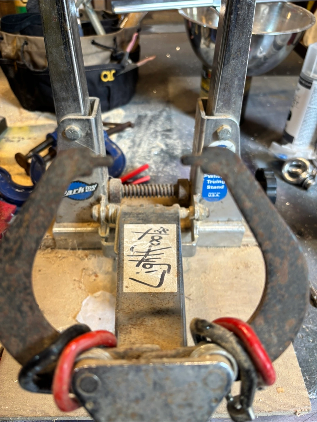Wheel truing stand. Metal construction. Some wear visible. A great way to bring yourself peace, while you get your bicycle rolling straight again.