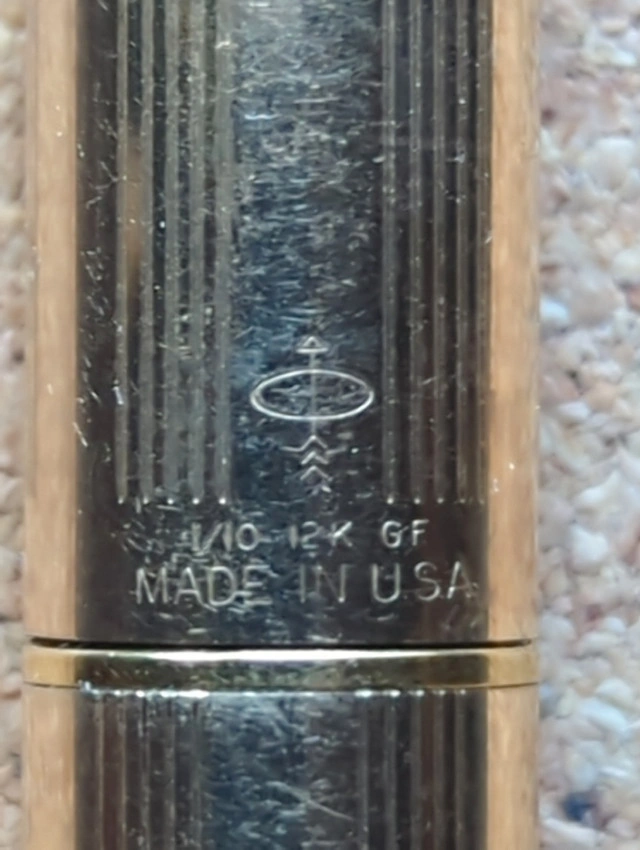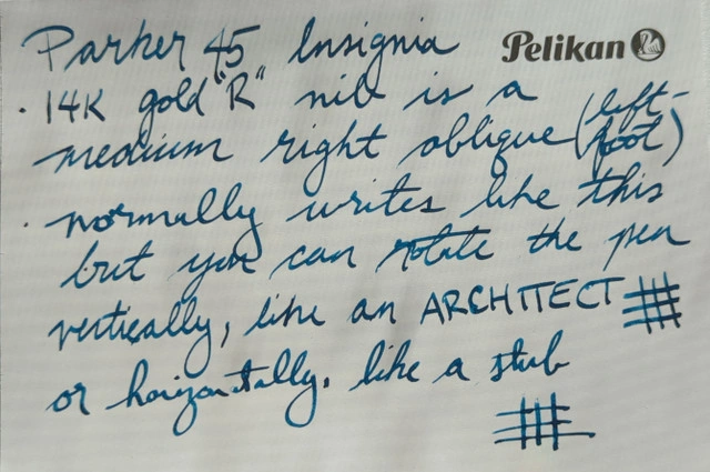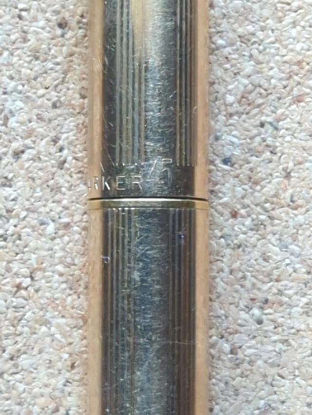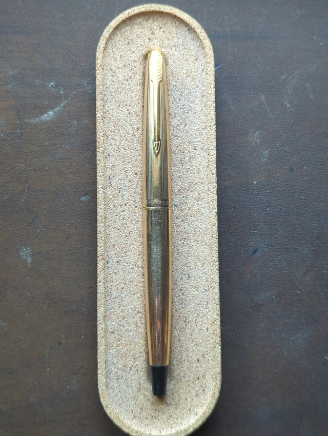37Vintage Parker 45 Insignia * 1965-1970 * 14K gold nib * "R" nib is a right medium oblique (left-footed); see pictures * nib is also a little soft * cap and body is 1/10 12K gold filled * well used; body has microscratches but no dents, chips, or deep scratches * oblique nibs give some line variation (see writing sample) Pick up only. I can meet at Spadina, Bathurst, or Dupont station.
