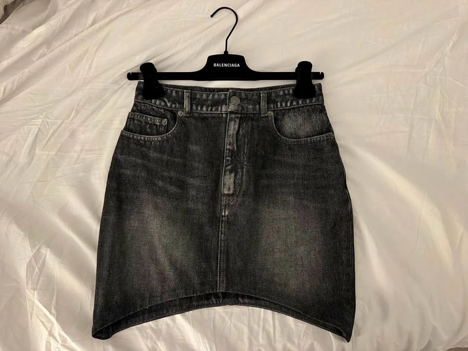 Stylish Balenciaga black wash denim mini skirt. High-waisted. Has a cool curved hem. Pockets on front and back. Super versatile. Brand new, never worn.