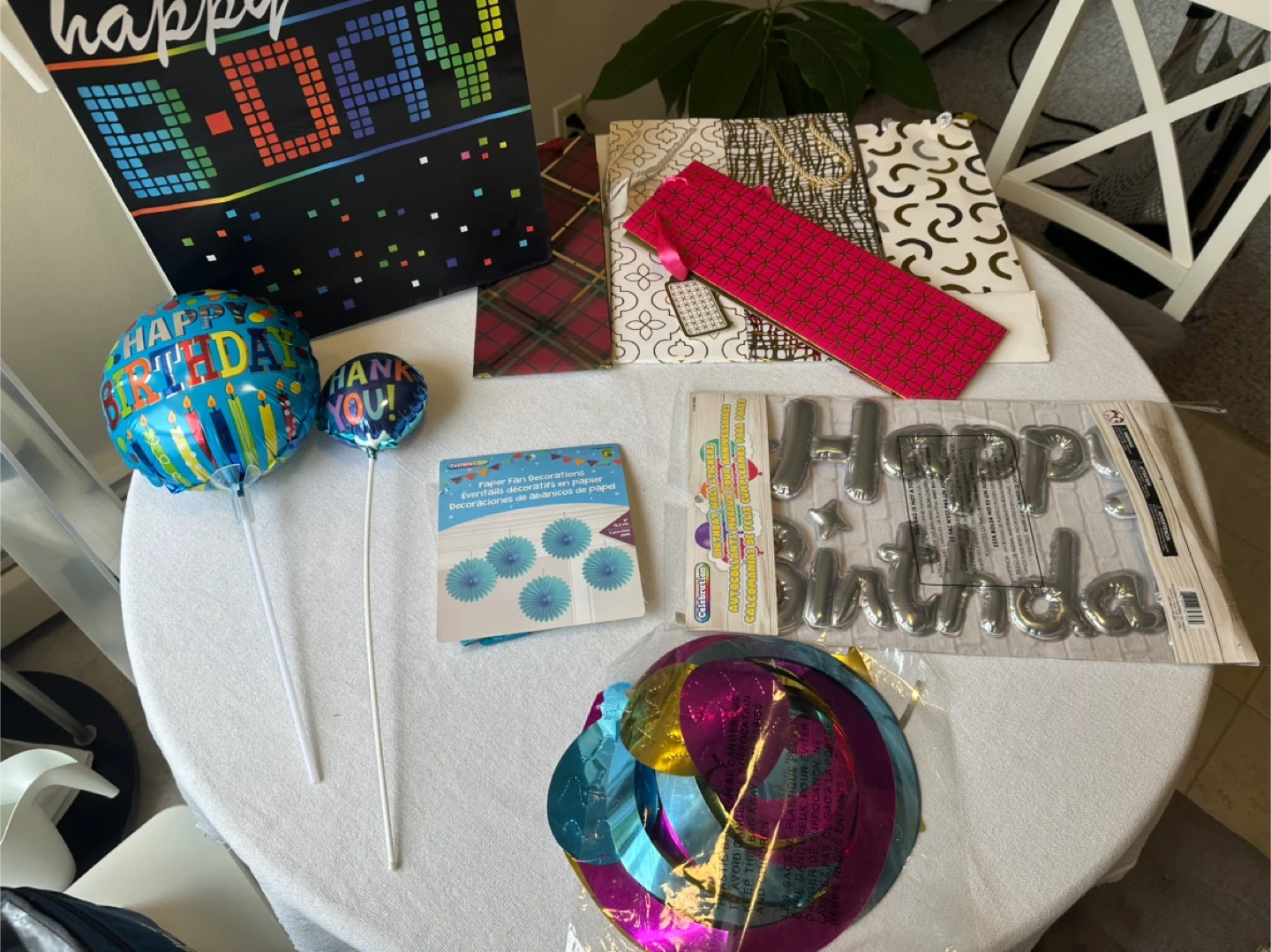 Assorted party decorations including gift bags, balloons, paper fan decorations, and a 'Happy Birthday' balloon banner! Perfect for your next celebration