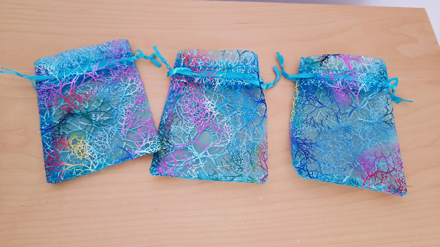 I'm selling a set of three turquoise drawstring pouches. They have a delicate, tree-like pattern in various colours. Perfect for storing small items or gifting!