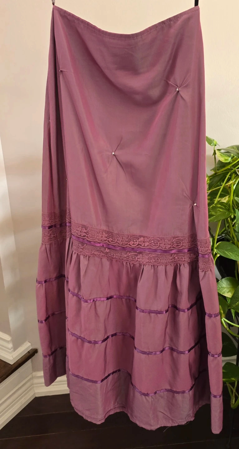 155Selling a lovely mauve tiered skirt in size small. It's a unique piece with beautiful detailing. Perfect for adding a touch of elegance to your wardrobe!