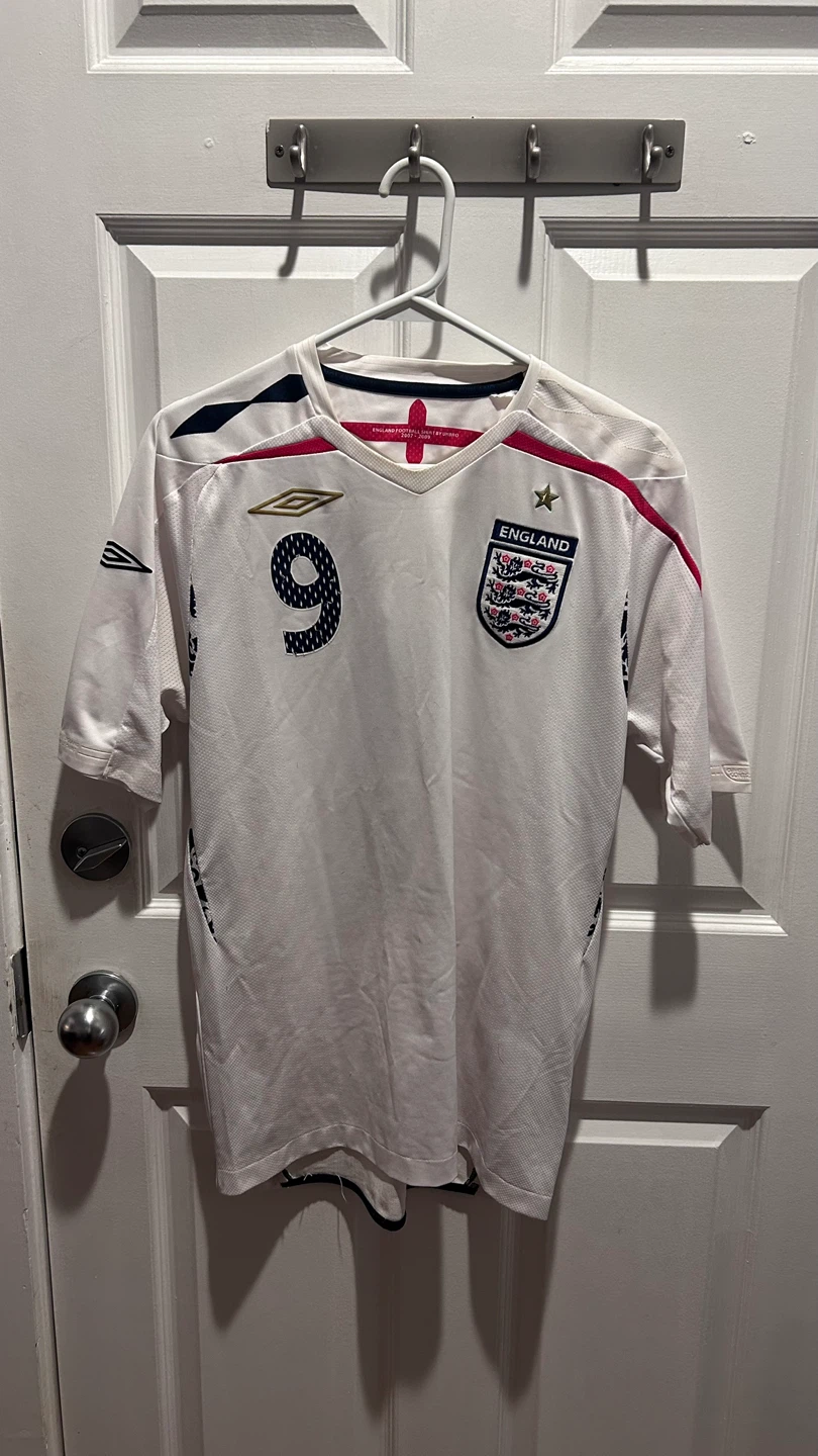 White Umbro England football jersey featuring Wayne Rooney's name and number 9 on the back. It has the England crest and a star on the front. Made from lightweight, breathable fabric for comfort. Perfect for any football fan!