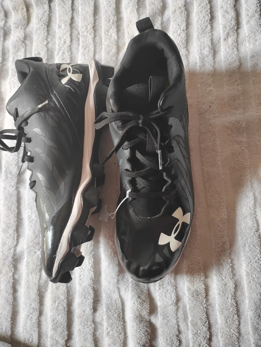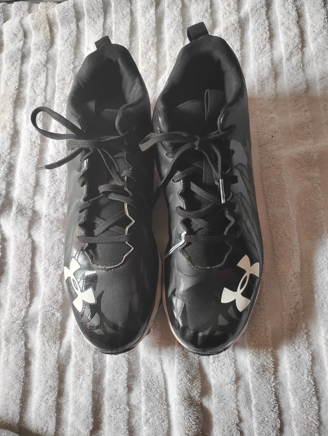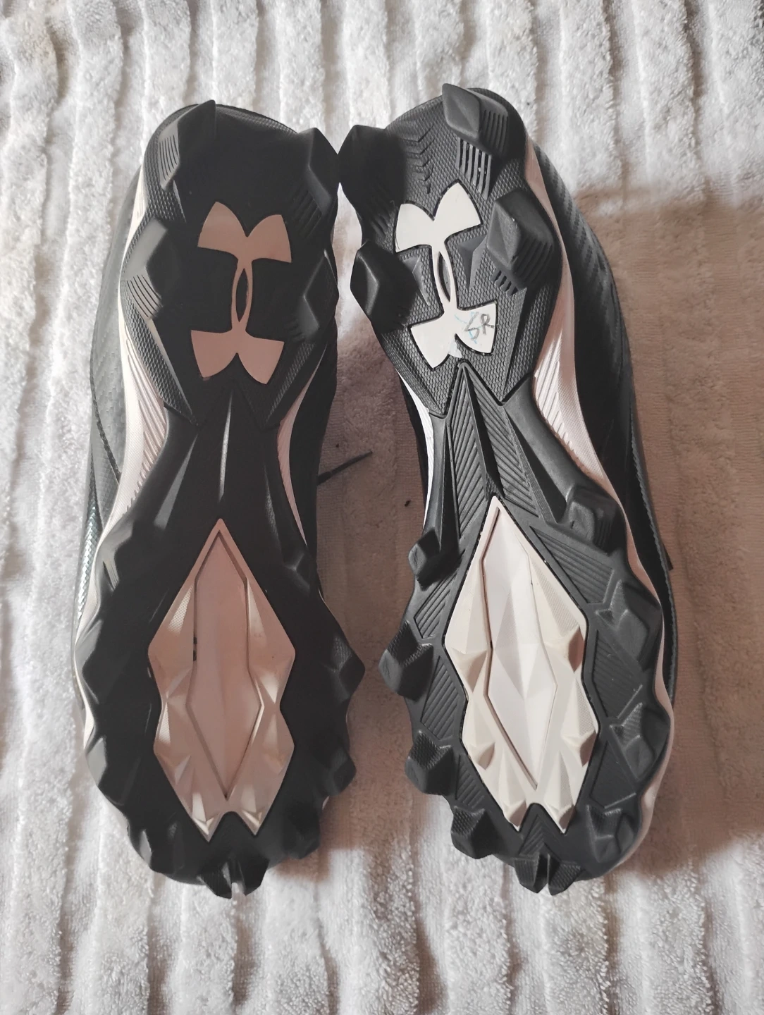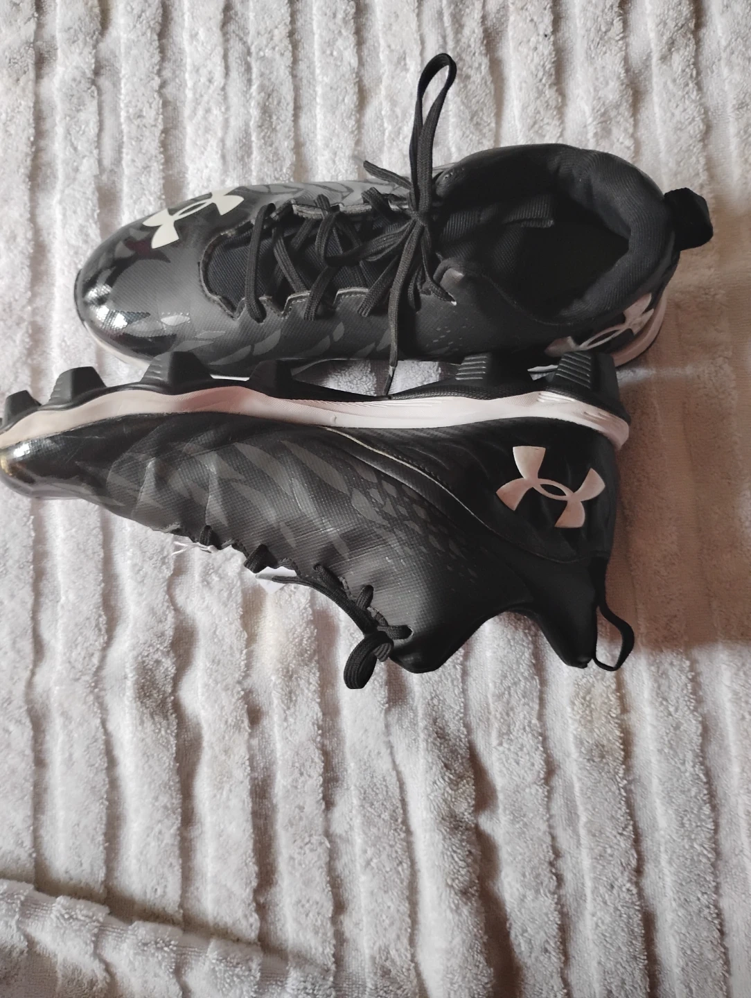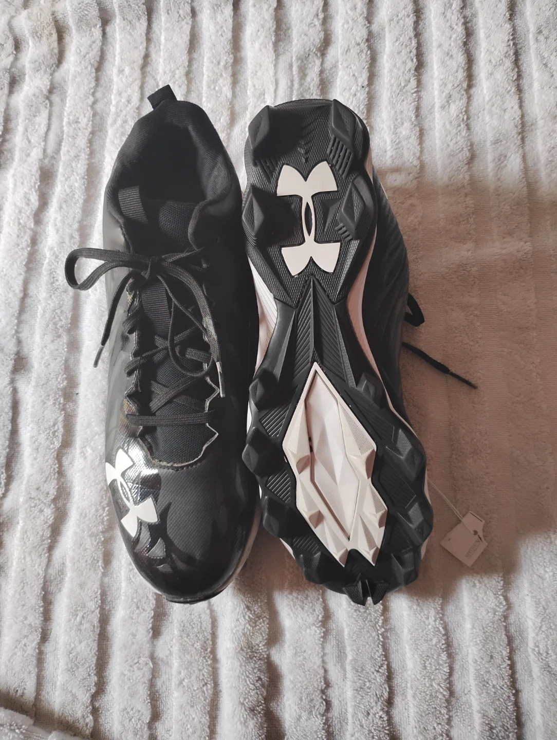 These are black Under Armour football cleats. They feature a durable synthetic upper and a supportive cleat plate for traction on the field. These cleats are designed for football players looking for performance and stability.