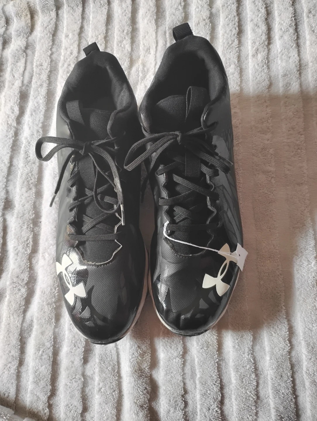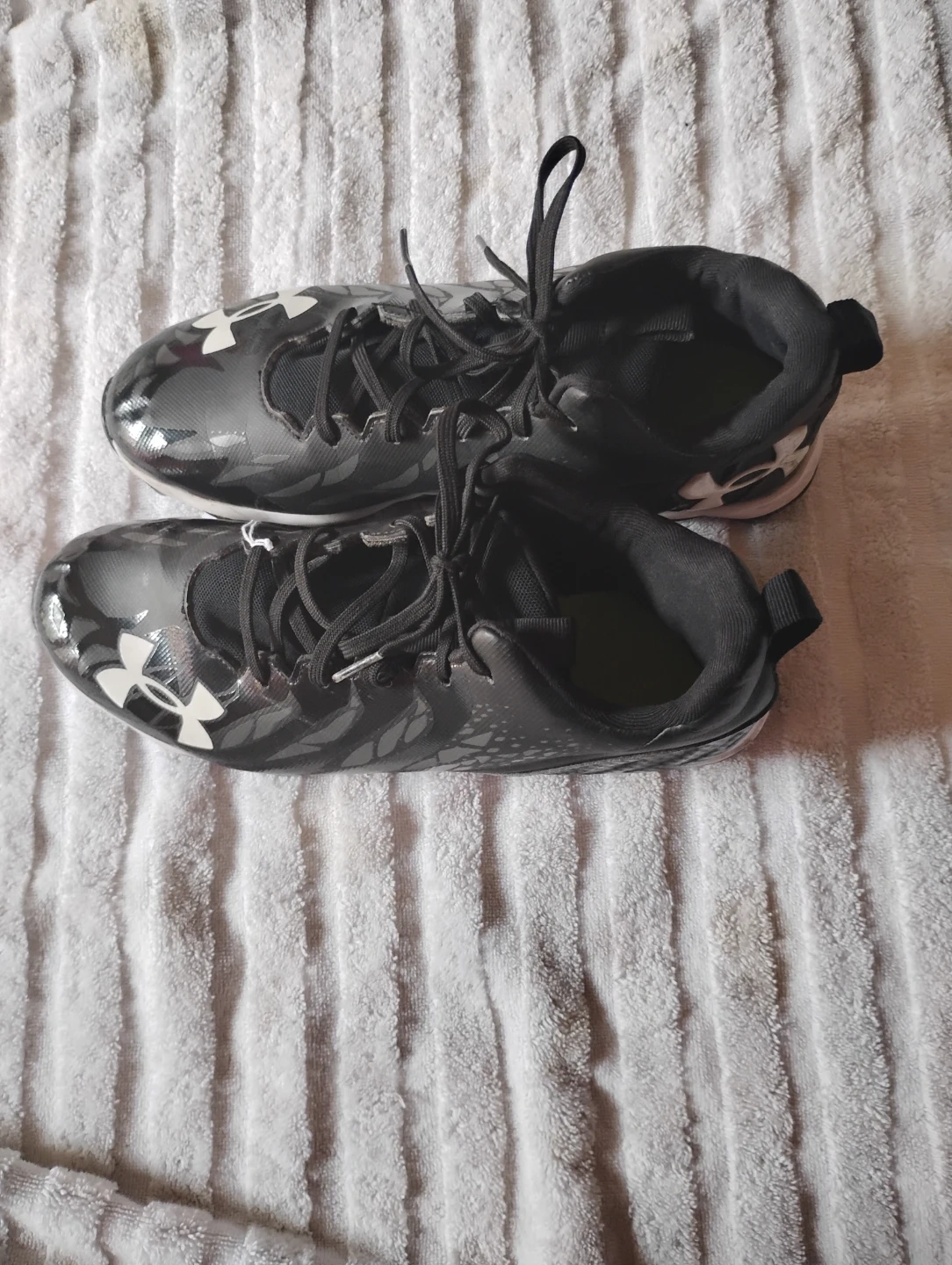 These are black Under Armour football cleats. They feature a durable synthetic upper and a supportive cleat plate for traction on the field. These cleats are designed for football players looking for performance and stability.