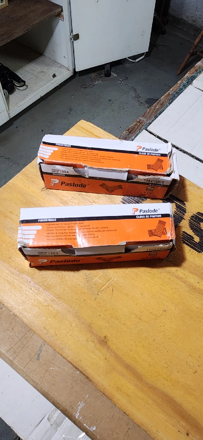 Selling two boxes of Paslode 18GA galvanized finish nails. Each nail is 1 1/4" in length. Great for finishing work!
