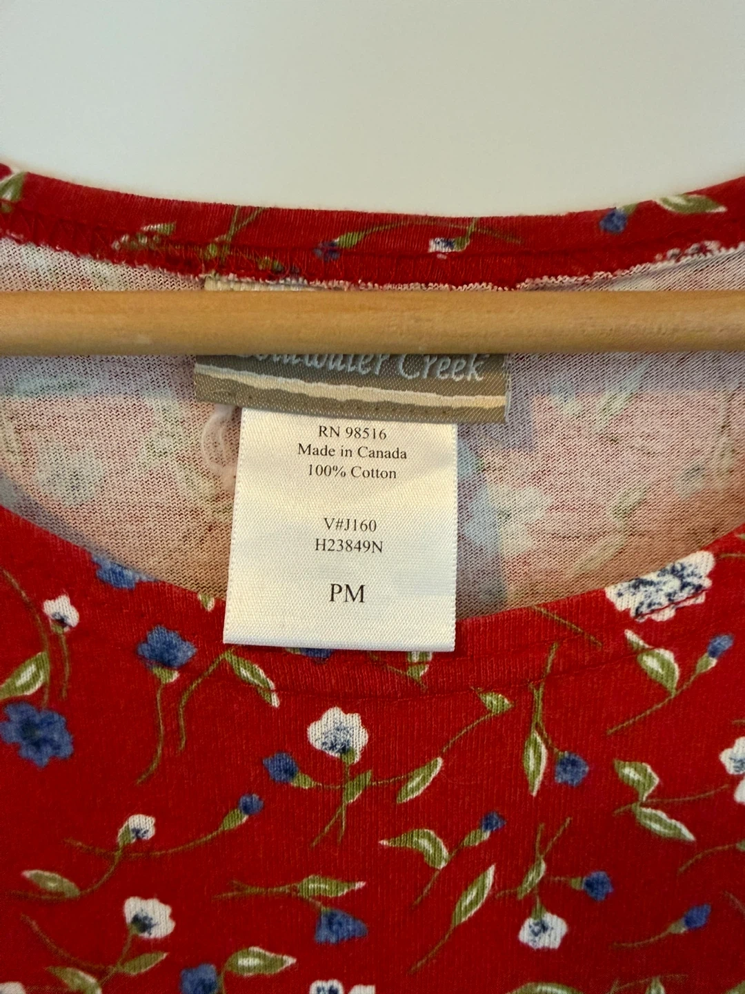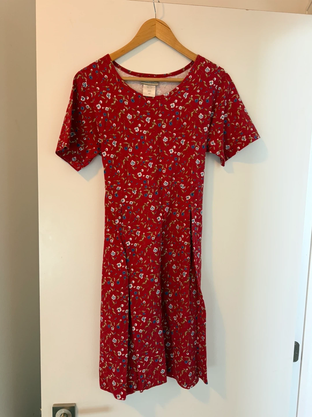 Sweetwater Creek vintage dress with a red floral print. Made in Canada from 100% cotton. This dress has short sleeves and a tie at the back. It fits a small or medium (the tie makes the sizing forgiving).
