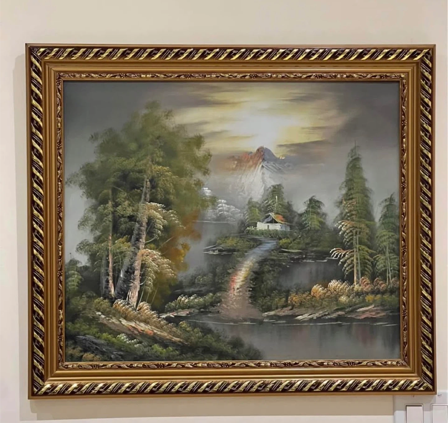 This is a framed oil painting depicting a serene landscape scene. It features a cabin nestled amongst trees with a mountain backdrop and a reflective body of water. The artwork is ready to hang.