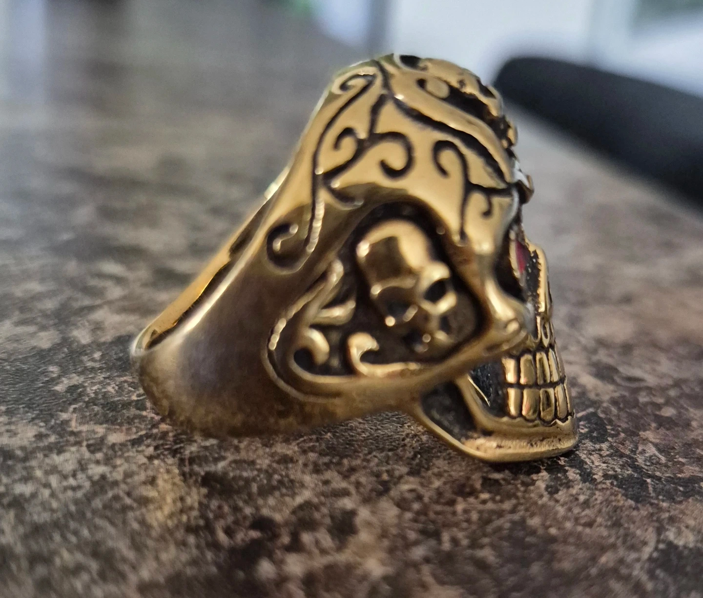 A striking skull ring featuring ornate scrollwork and two vibrant red gemstone eyes. It's made of a gold-toned metal, likely brass, and has a substantial feel. This ring is a statement piece for anyone who appreciates gothic or biker-inspired style.