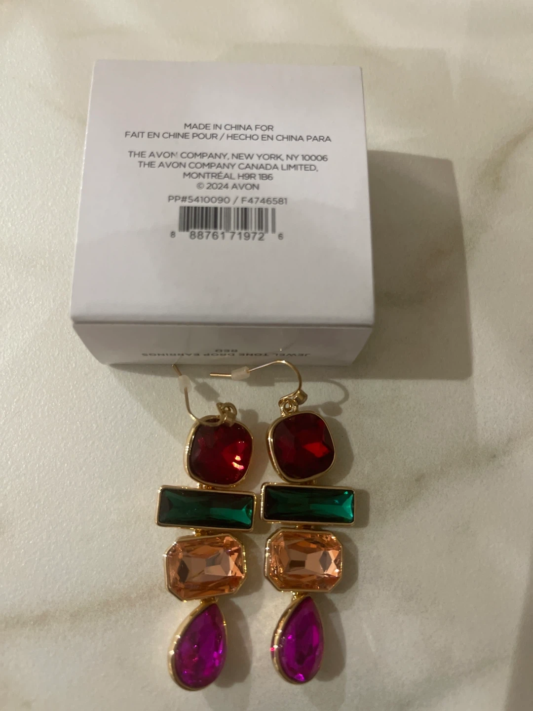 Avon Studio 1886 drop earrings with colourful gem details. Features gold-tone hardware and a dangling design. Includes original box.