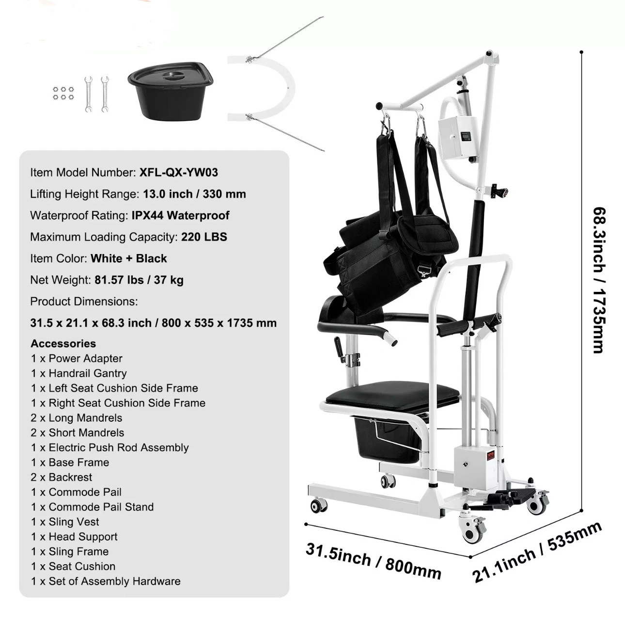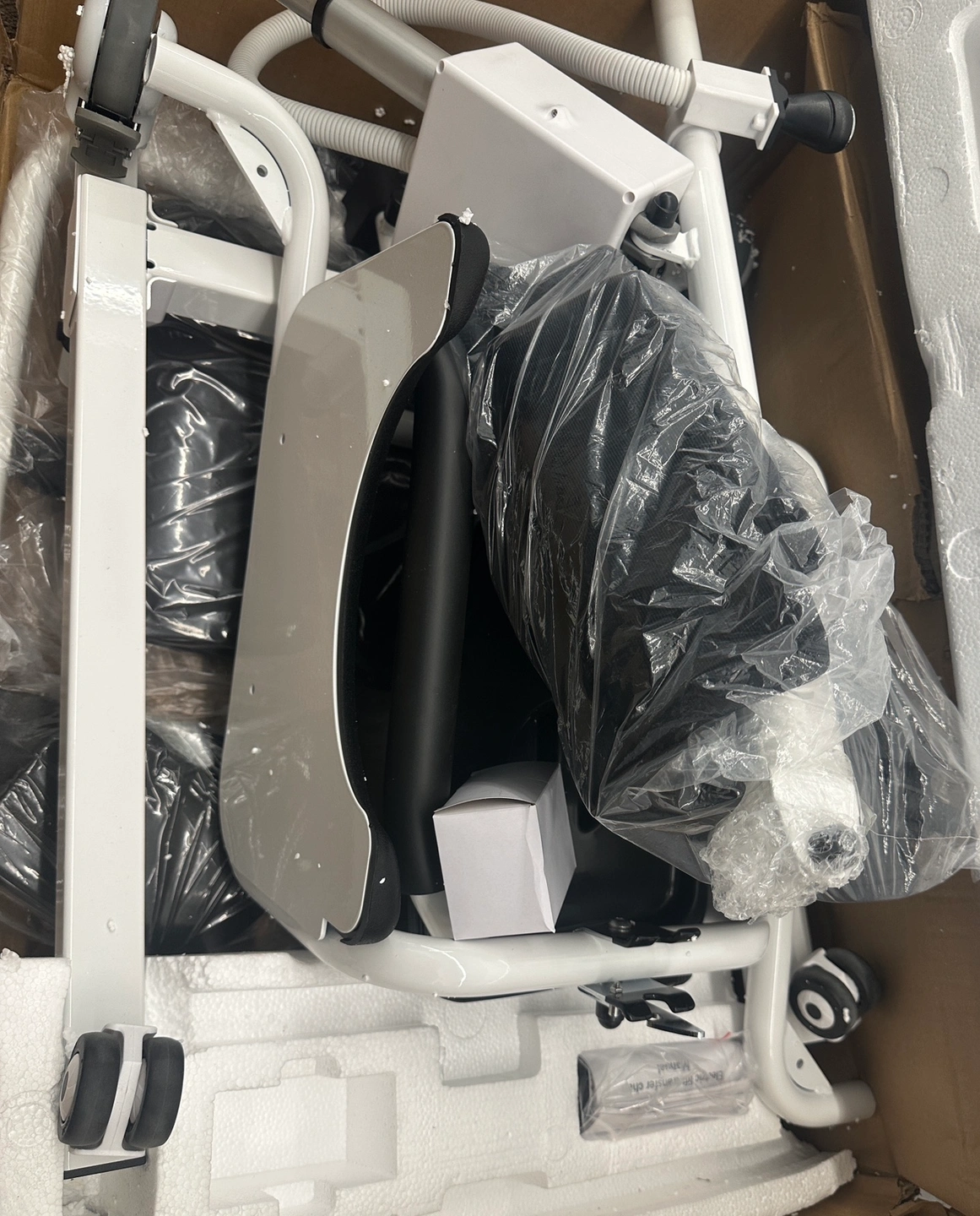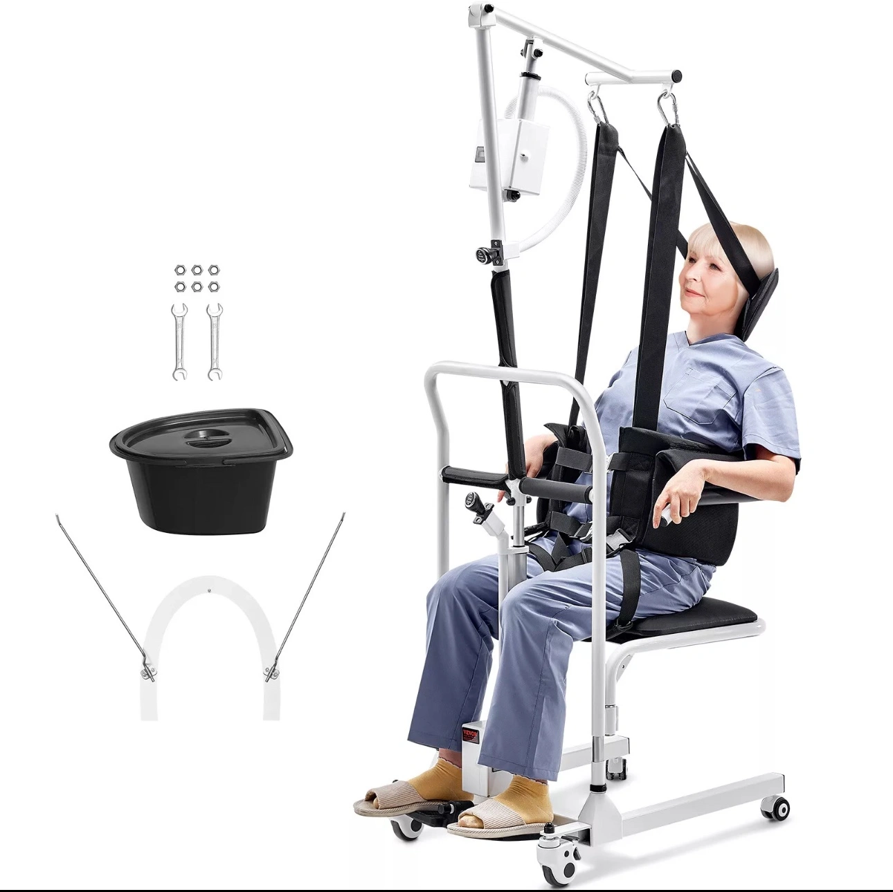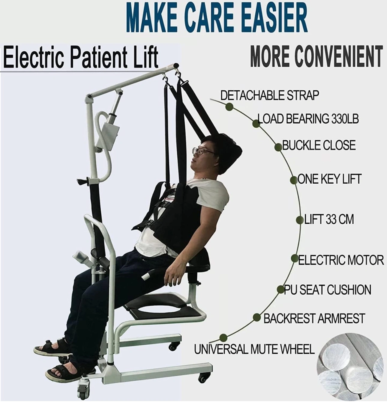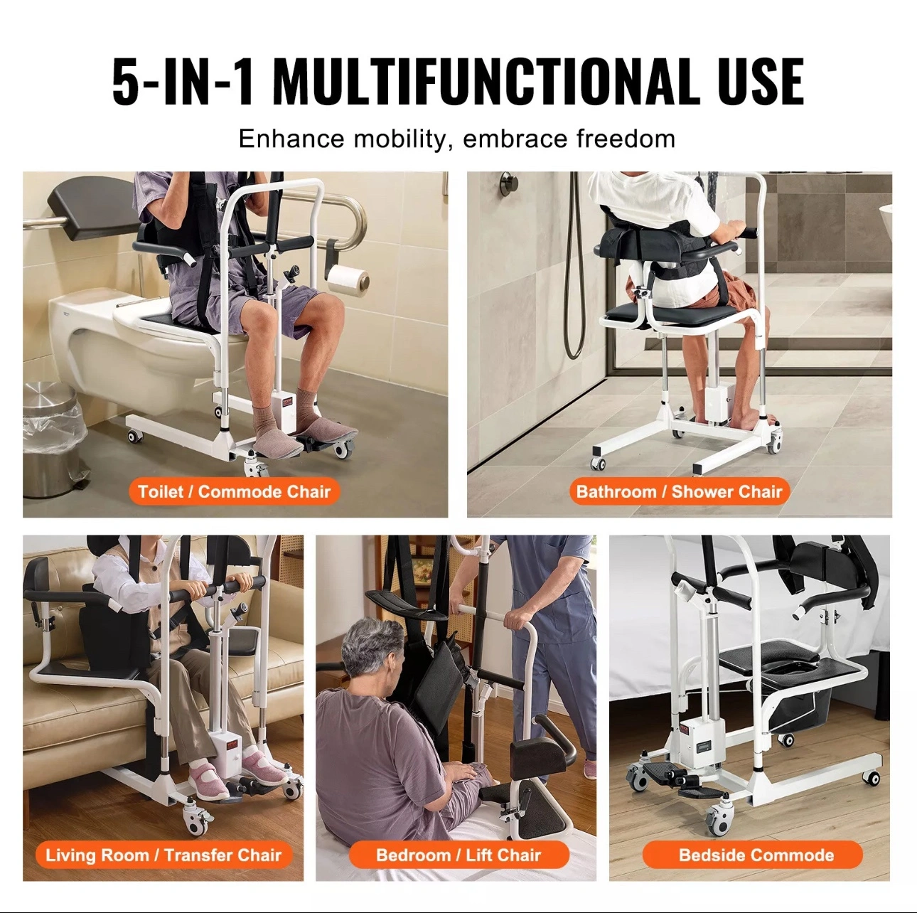 Patient Lift Electric for Home with Commode, Patient Transfer Lifts for Home Use and Facilities - Floor,Bed,Toilet and Chair Lifting The sling system is flexible and free to disassemble Easily transfer from bed to wheelchair, recliner or shower chair, or from sofa to bed or even from the floor 180° split seat can reduce the time and effort of moving the patient When sitting for a long time, put a soft cushion on it, which can replace chairs, sofas, wheelchairs and other tools, and also provide a comfortable sedentary environment for your need One-key lifting, smooth and safe, strong thrust, silent operation, free loading and unloading, non-slip foot brake NOTE: Open-box, New never used or assembled but tested the motor. Excellent working condition