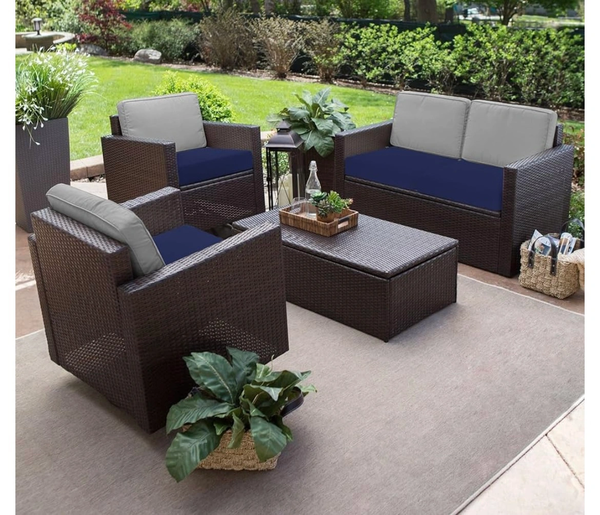 56Set of 2 blue outdoor chair cushions. The cushions are 24" x 24" x 4" and come with adjustable ties. New with tags. Cushions are vacuum sealed in packages. Cushions for outdoor patio furniture. Online price $196.00