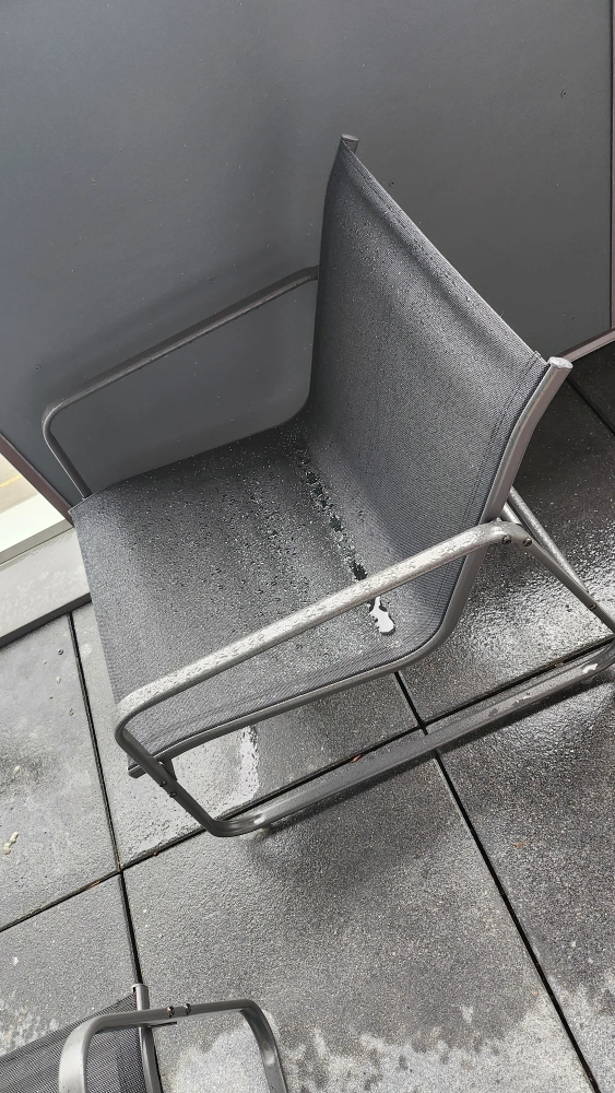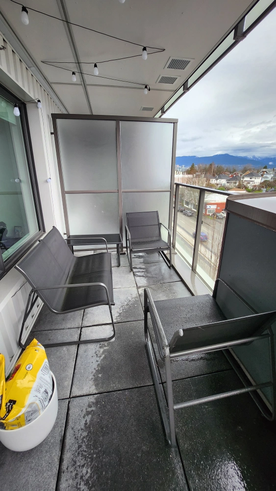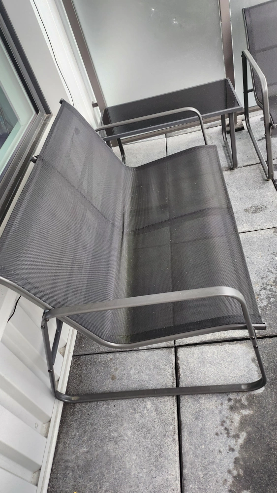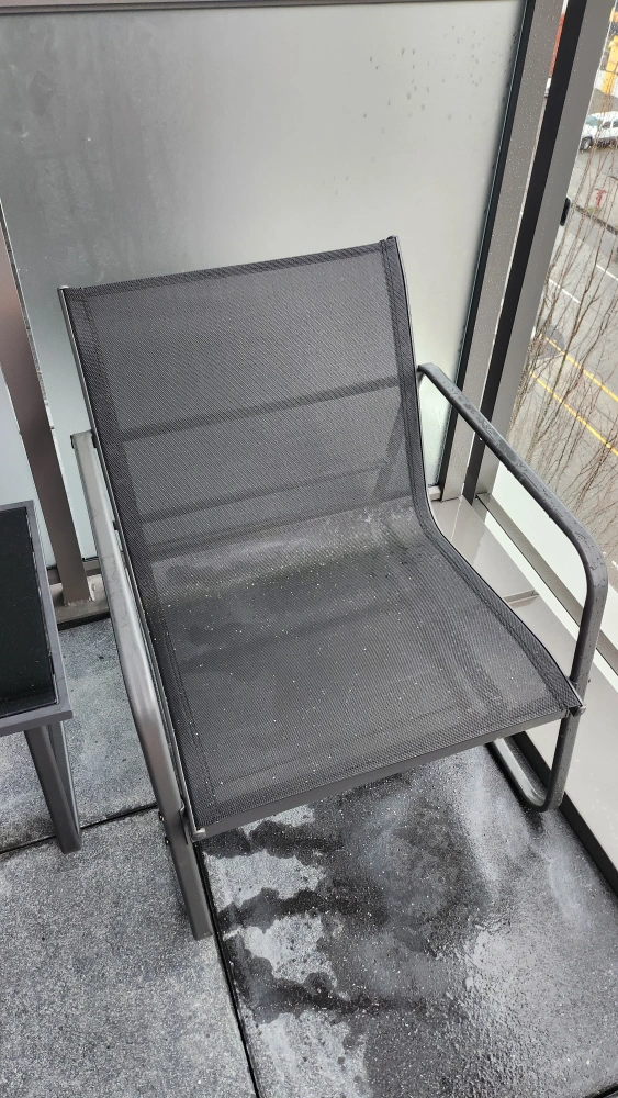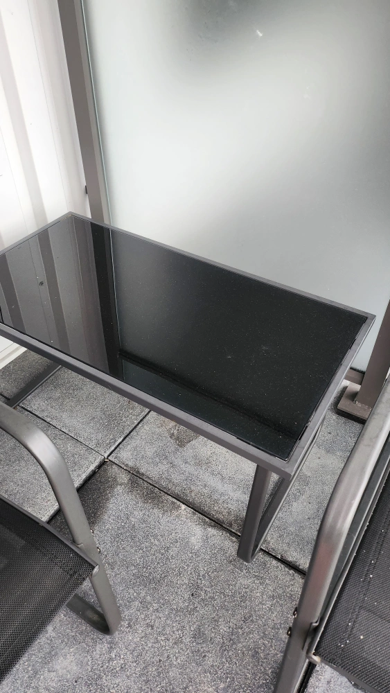 Out of province move - Black metal patio furniture set with two chairs and a small table. The chairs are made of mesh fabric and have metal frames. The table is made of metal with a black glass top. The set is in good condition.