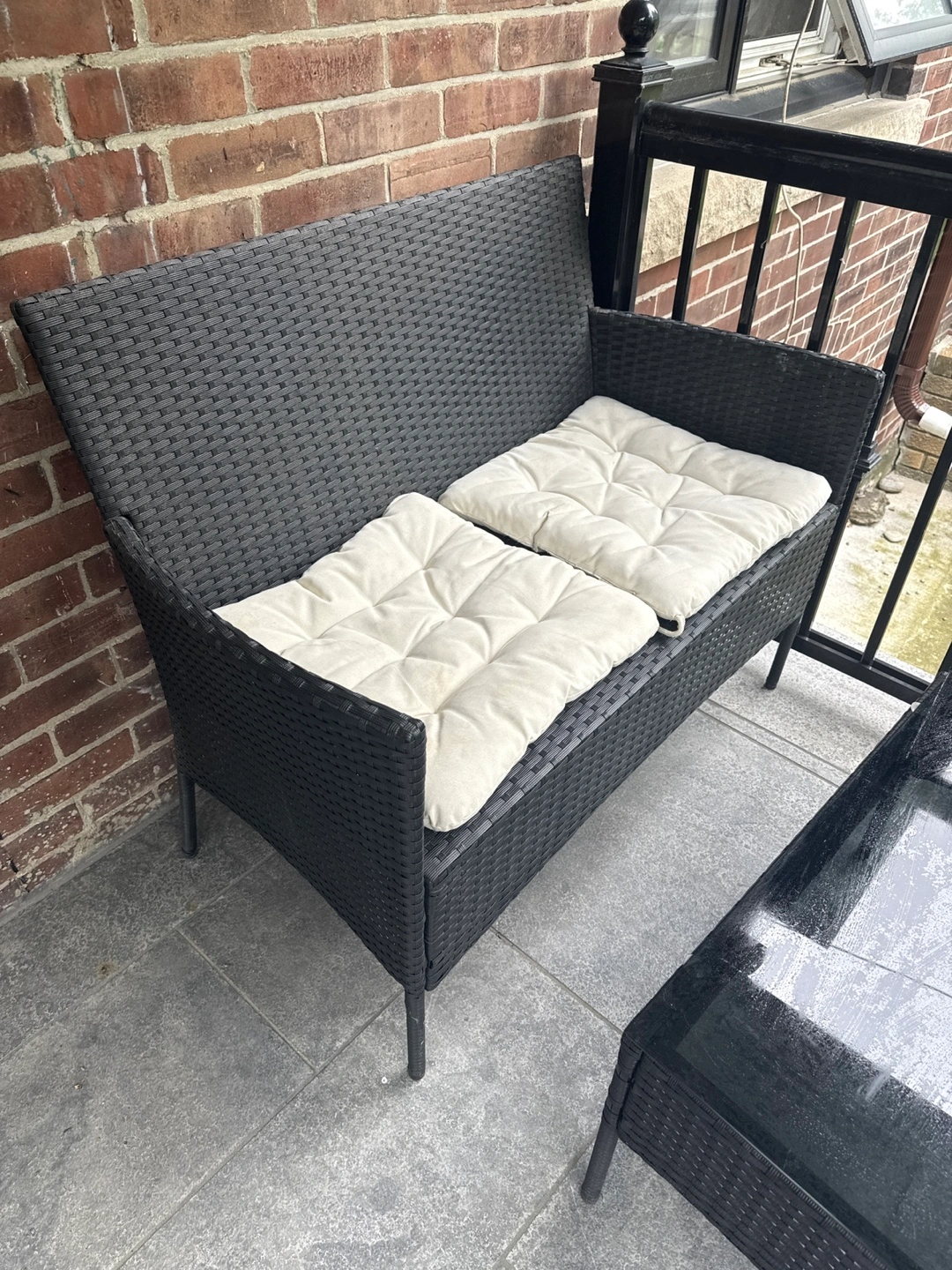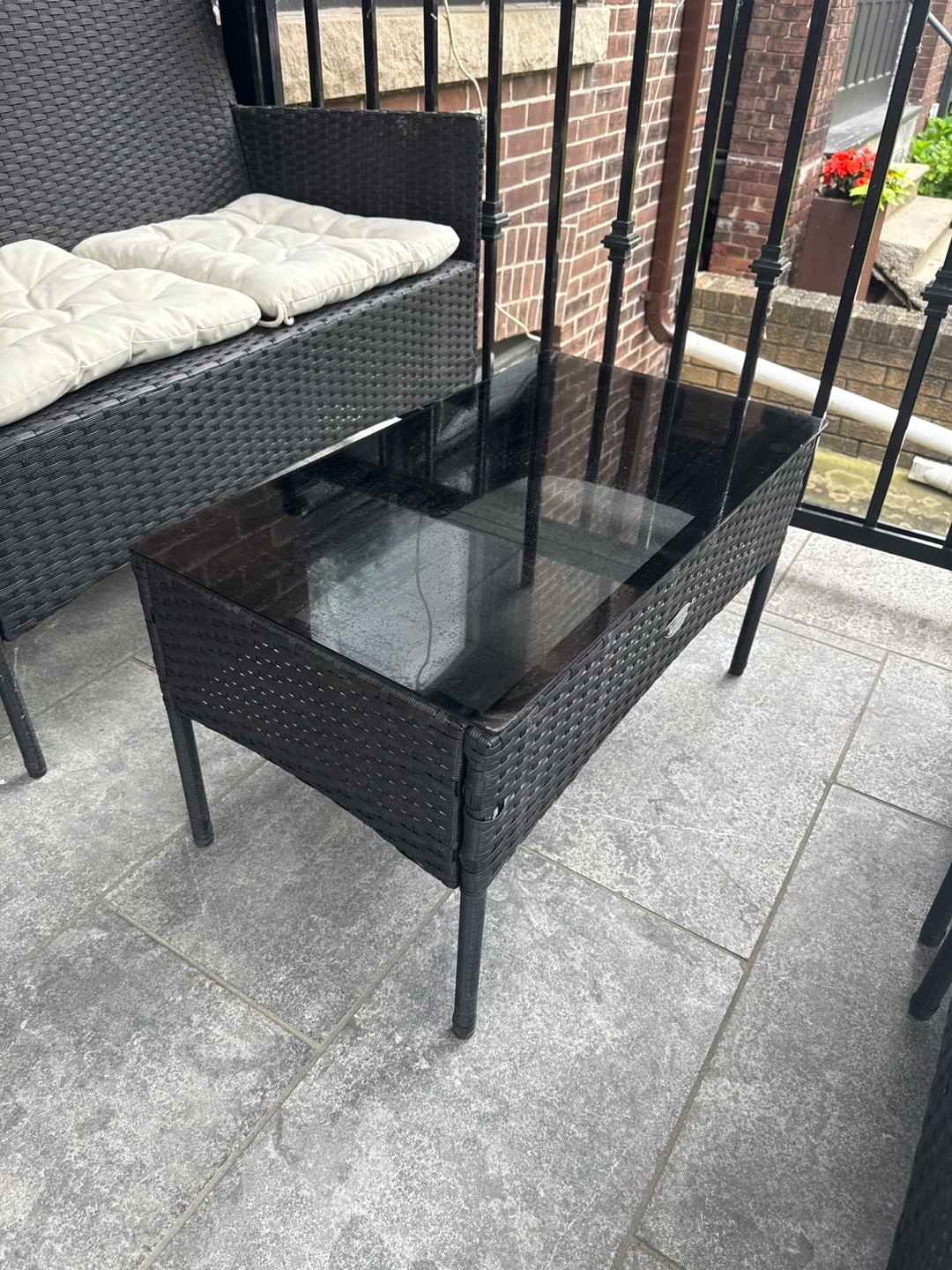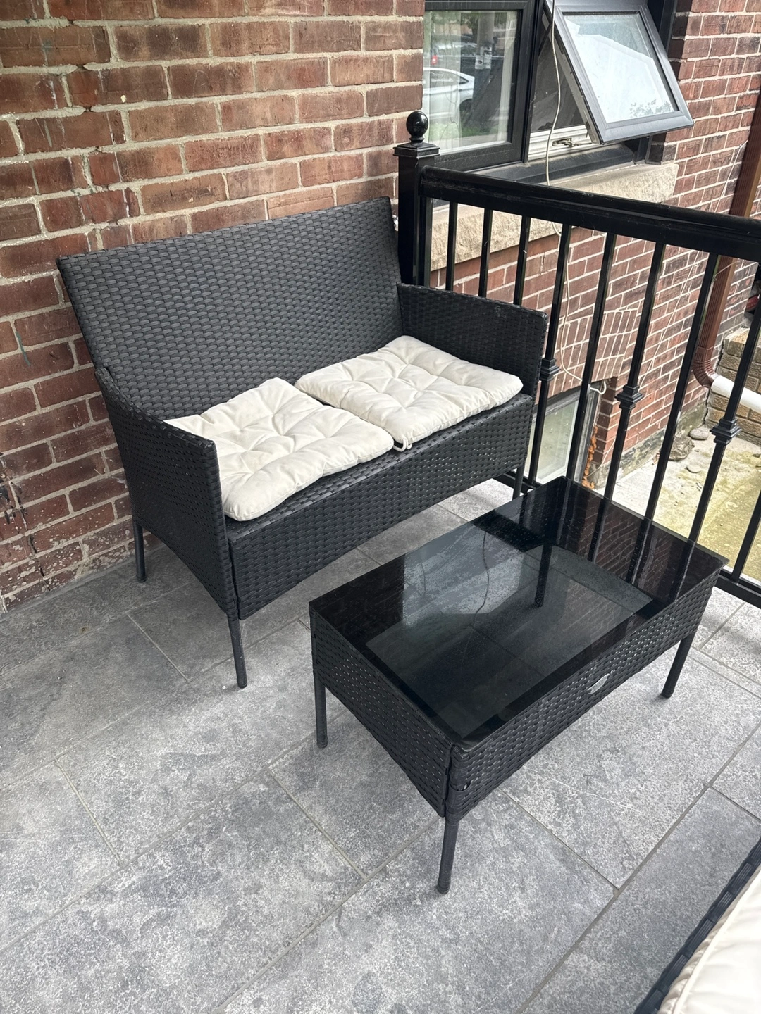 A nice patio set. Features a loveseat with two cushions, two single chairs with cushions, and a small table. Constructed with a woven exterior, metal legs, and glass table top. Find some peace by relaxing on this patio set, perhaps with a nice cup of tea.