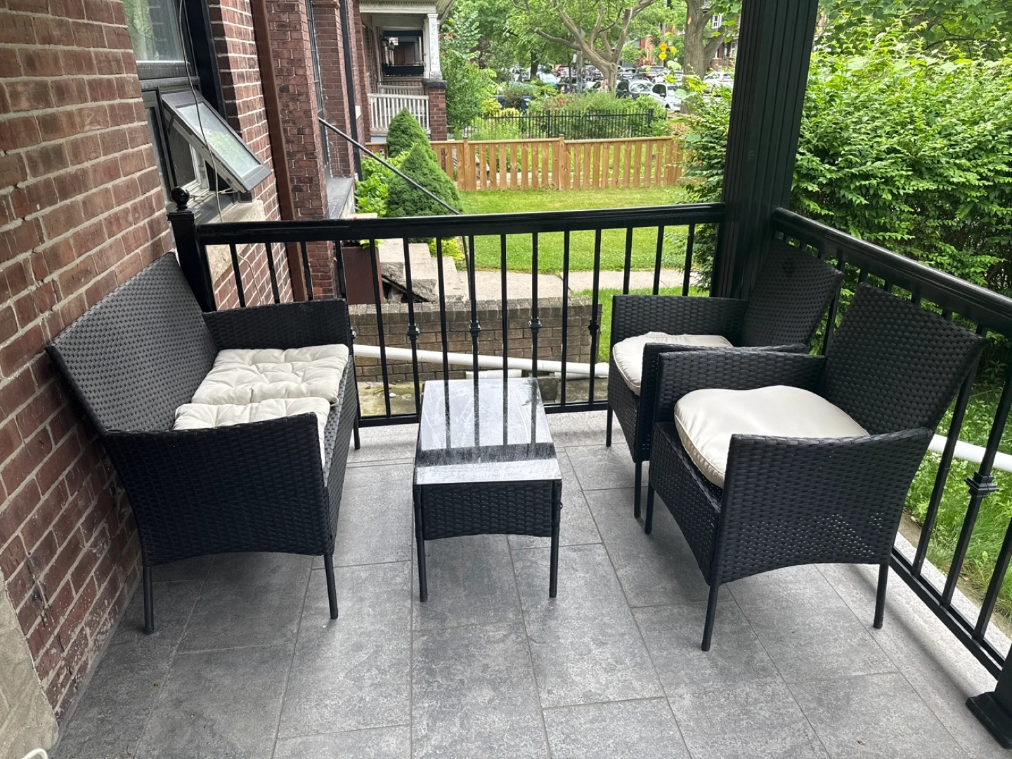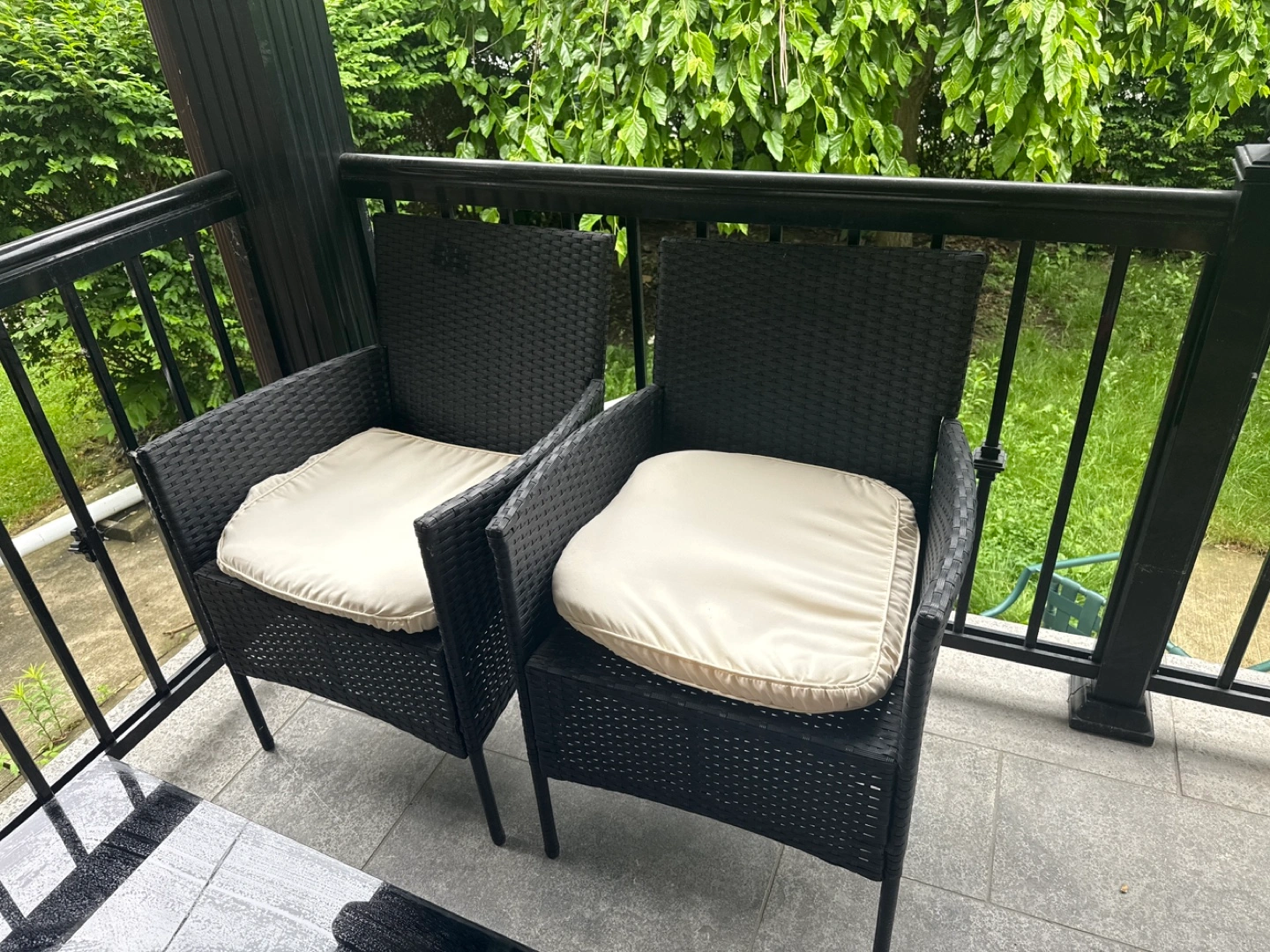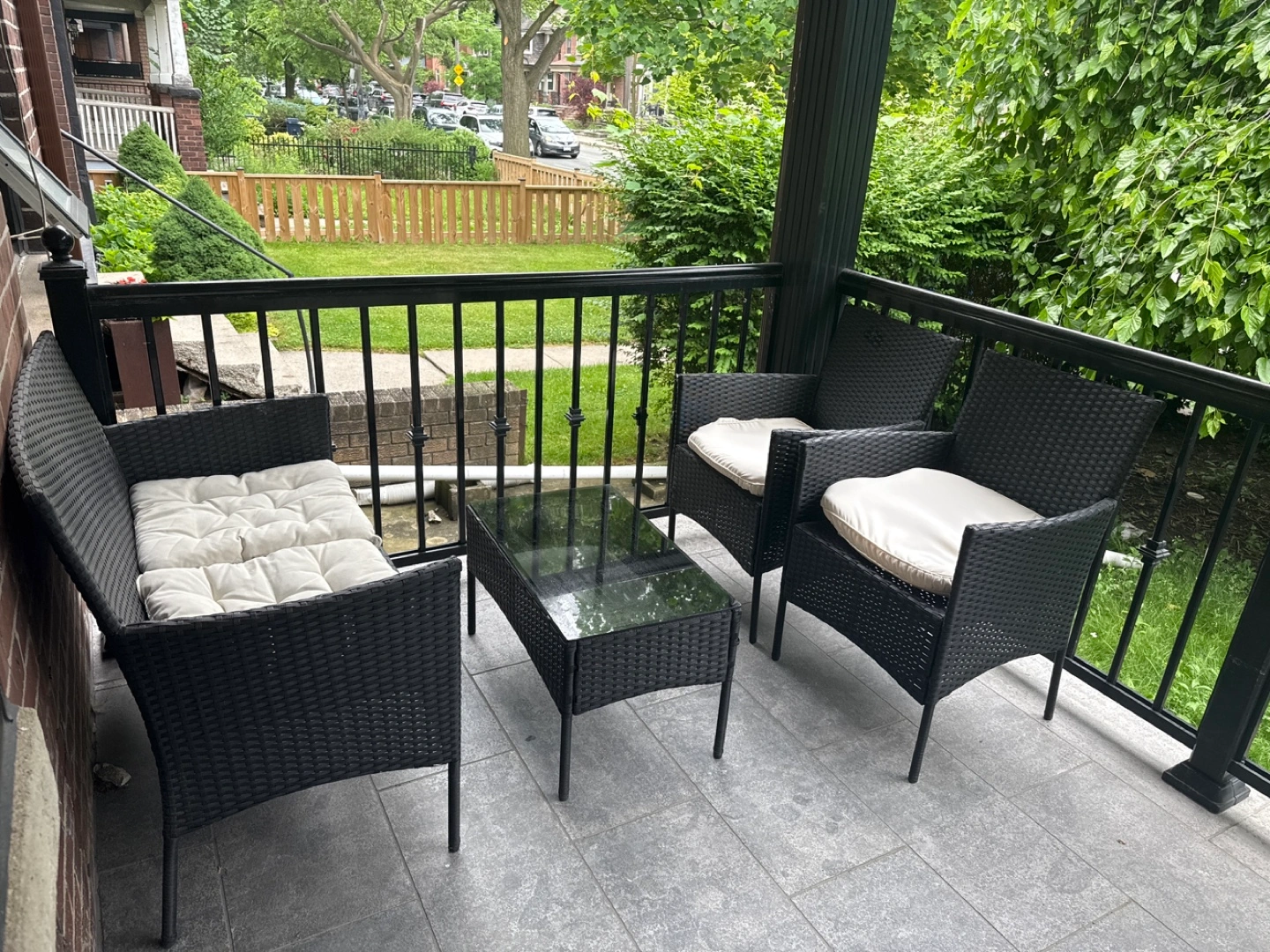 A nice patio set. Features a loveseat with two cushions, two single chairs with cushions, and a small table. Constructed with a woven exterior, metal legs, and glass table top. Find some peace by relaxing on this patio set, perhaps with a nice cup of tea.