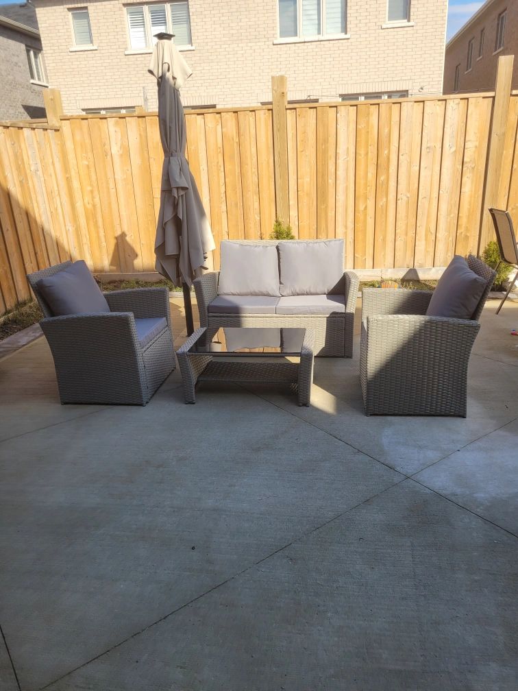 Outdoor patio furniture set. Features two armchairs, a loveseat, and a coffee table. Comes with an umbrella. Perfect for sipping a refreshing beverage outdoors.