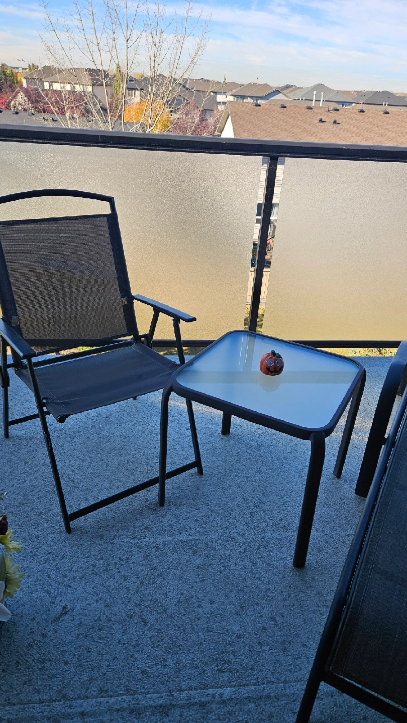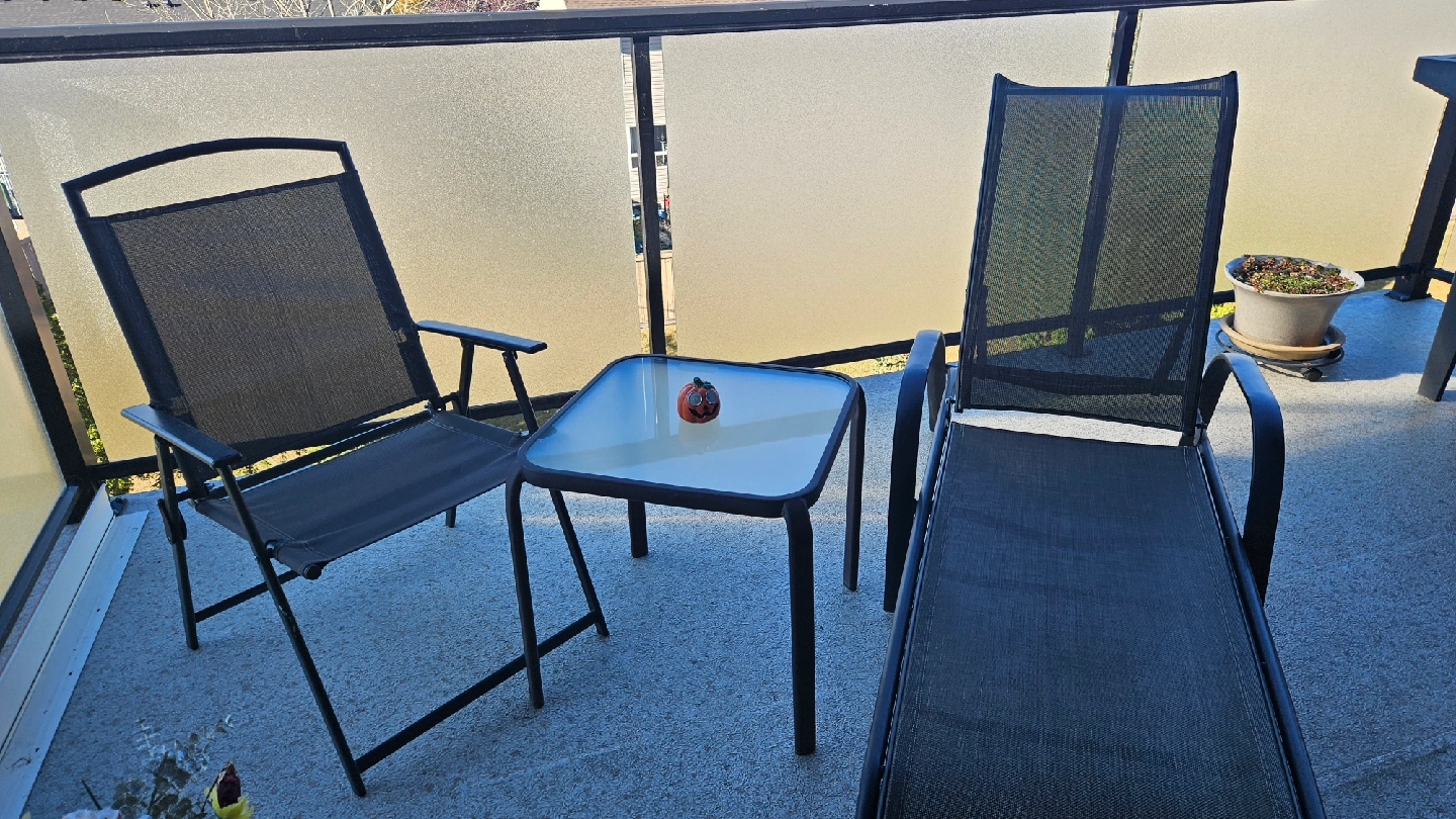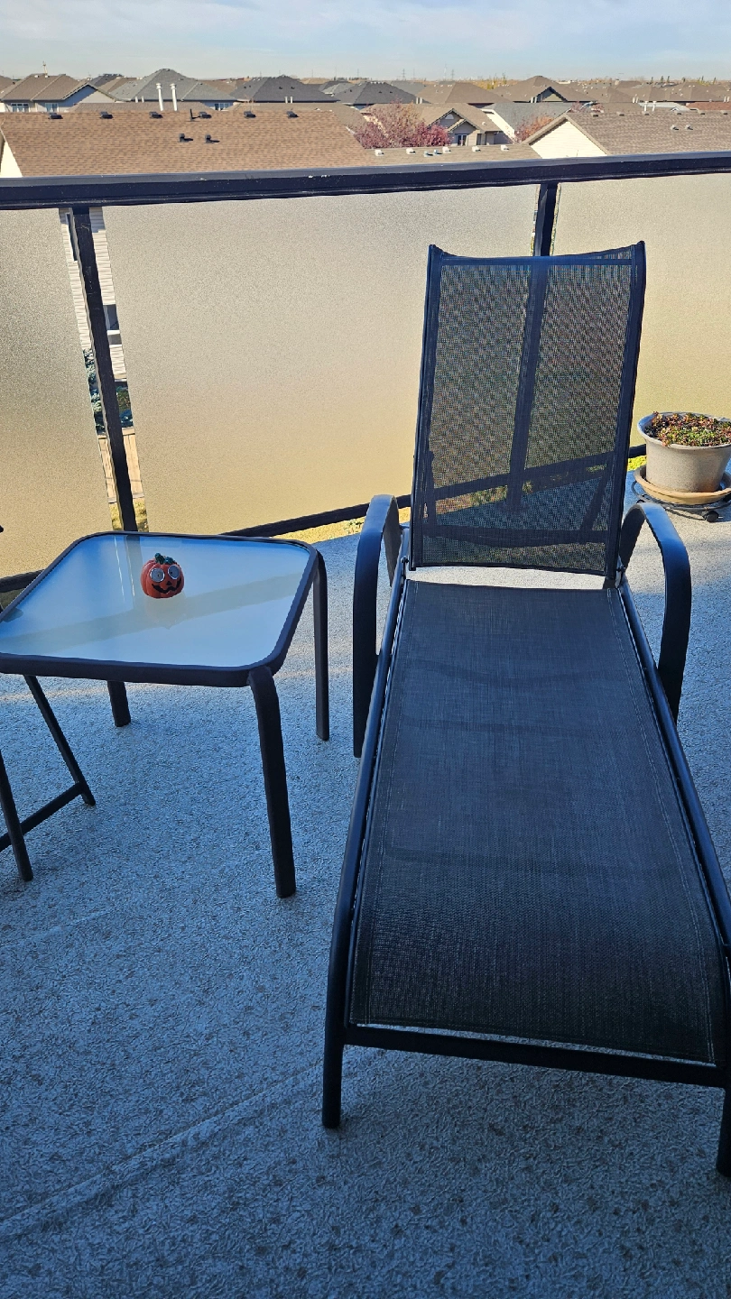 Selling a patio set that includes a chair, a lounger, and a small table. Perfect for enjoying the outdoors on your balcony or patio. The set is in good condition and ready for a new home!