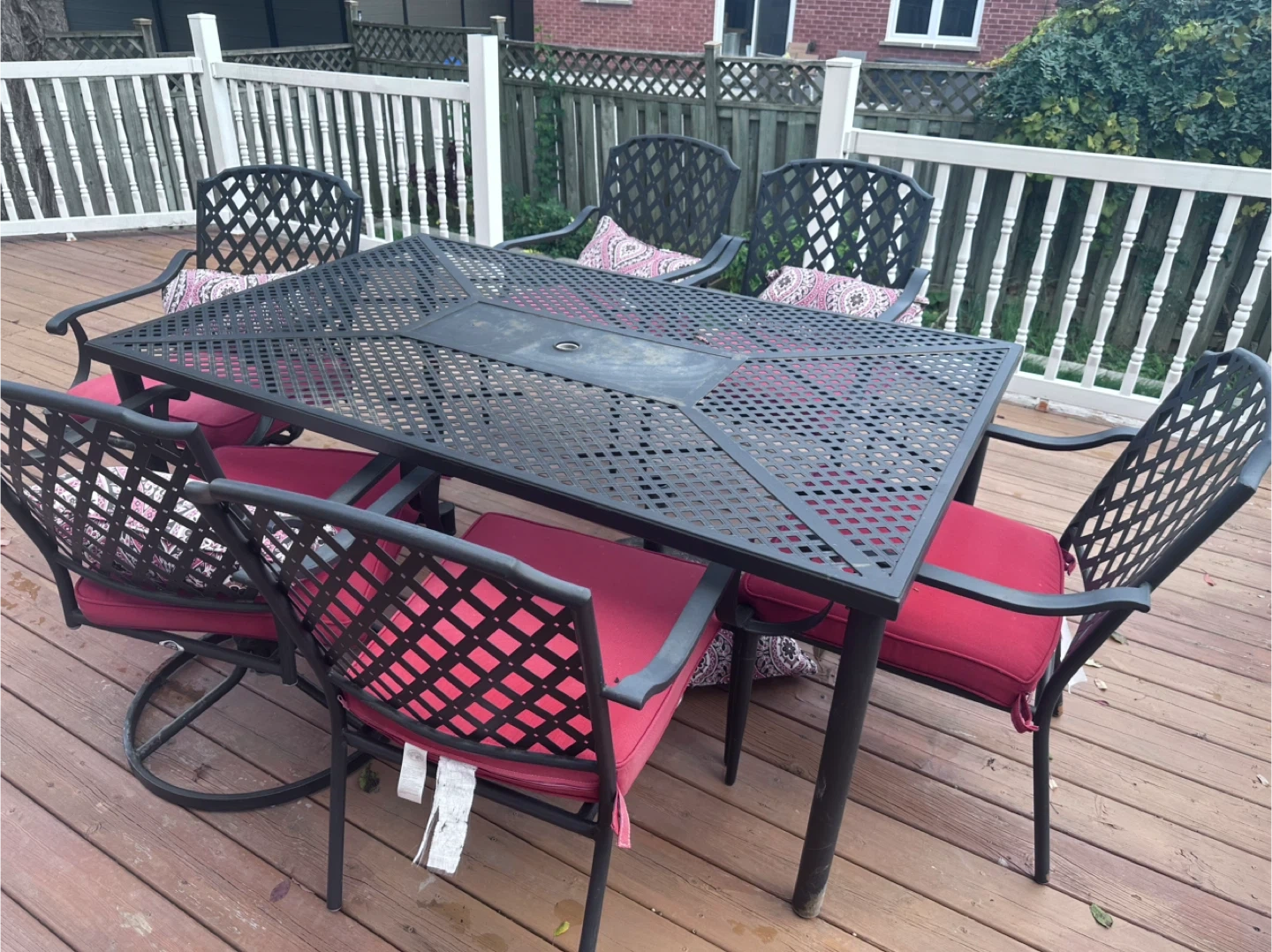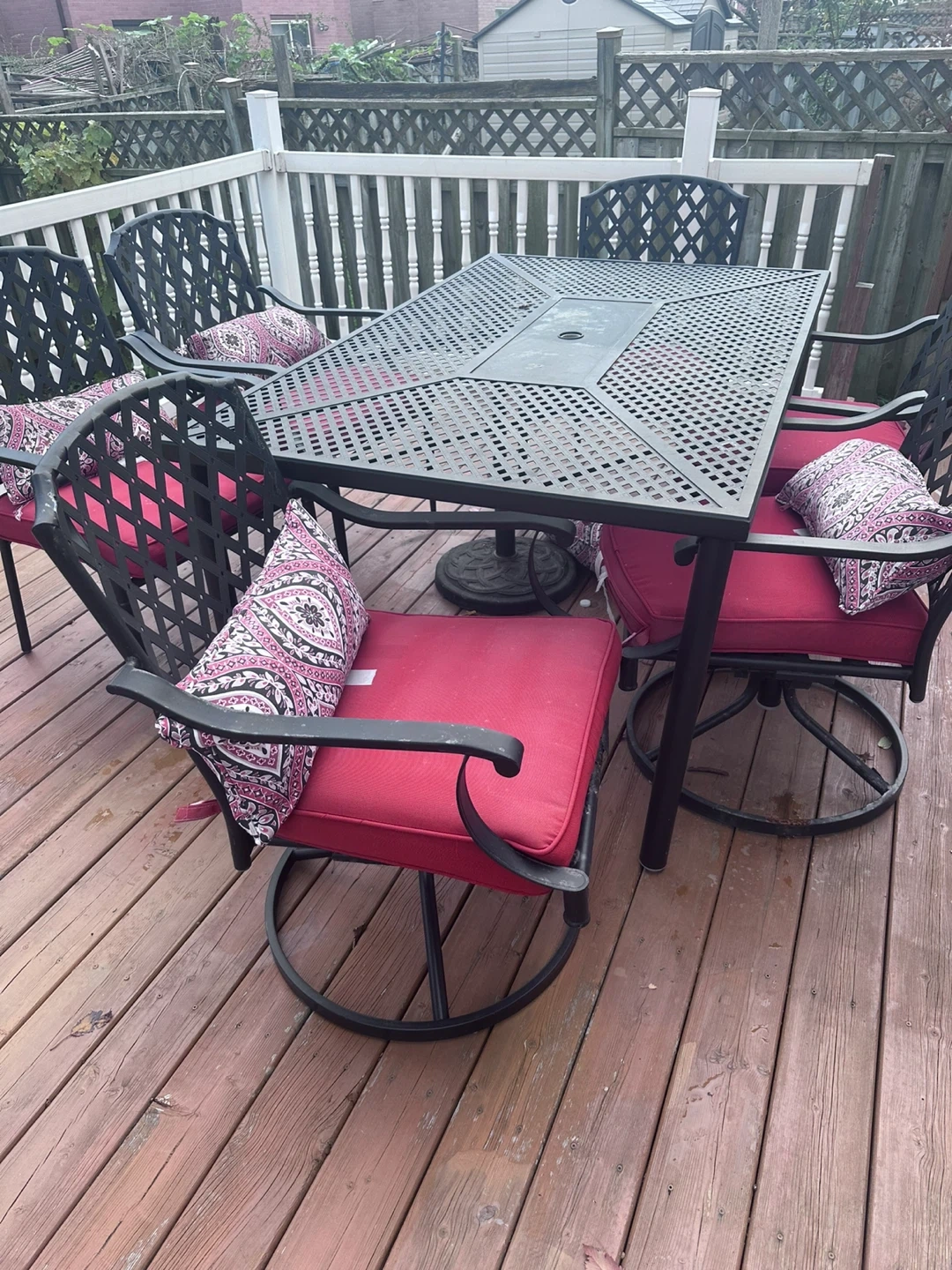 22Selling a patio set that includes a table and six chairs. The set features a metal frame with a lattice design. The cushions are a vibrant red colour. Markham, Middlefield/steeles, pick up only