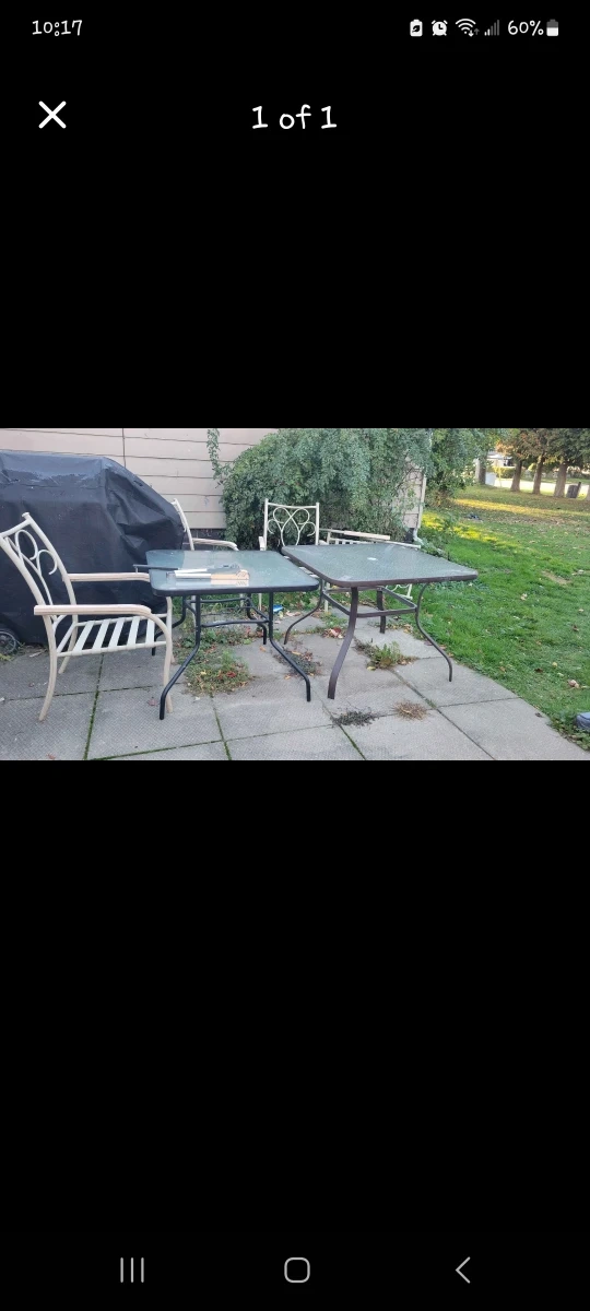 15Selling a patio set that includes two tables and three chairs. The tables have a glass top and metal frame. The chairs are metal with a decorative back. Great for enjoying the outdoors!