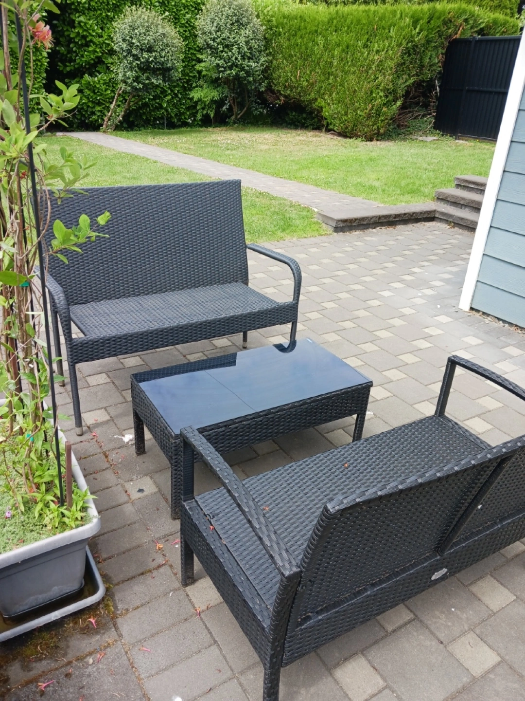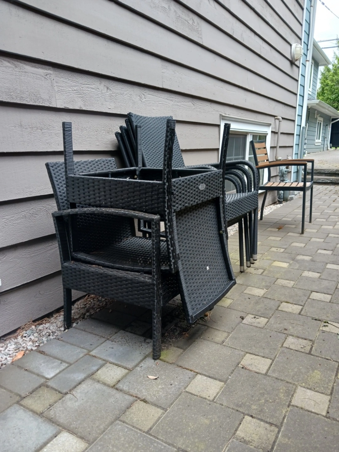 Complete outdoor patio set in great condition! Includes: • 1 patio table with 6 chairs • 2 outdoor couches with matching coffee table • Grey weather-resistant cushions (very comfortable!) • Matching grey planter Neutral grey color scheme fits any outdoor space. Gently used, well cared for. Perfect for summer entertaining or relaxing! Pickup only.