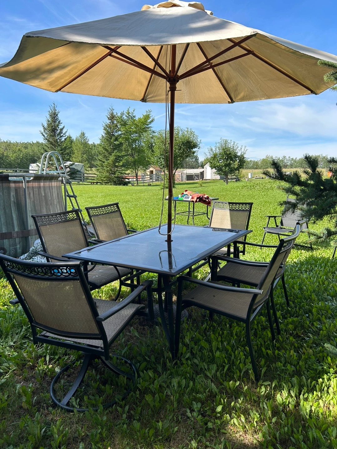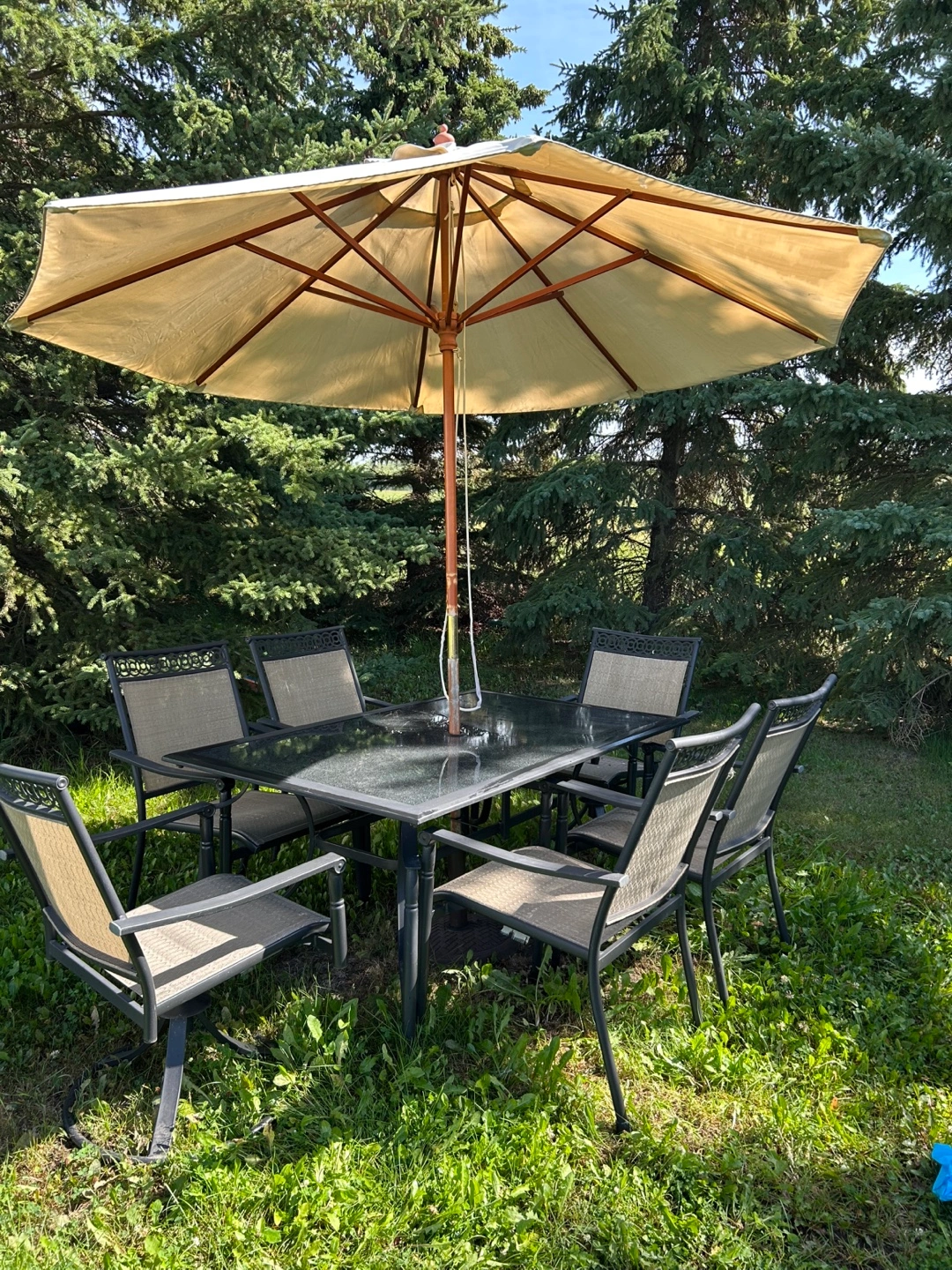 Selling a patio set that includes a table, six chairs, and an umbrella. It's perfect for enjoying those sunny days in the backyard. The set is in good condition and ready for a new home! $150 Pick up only by south cooking lake