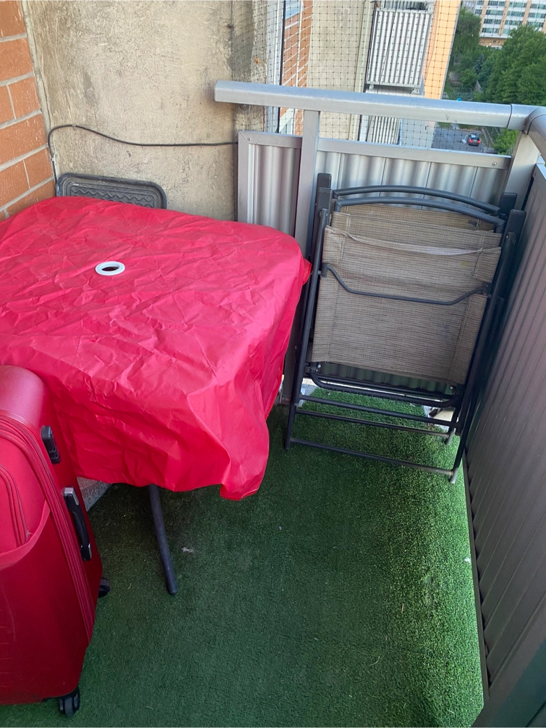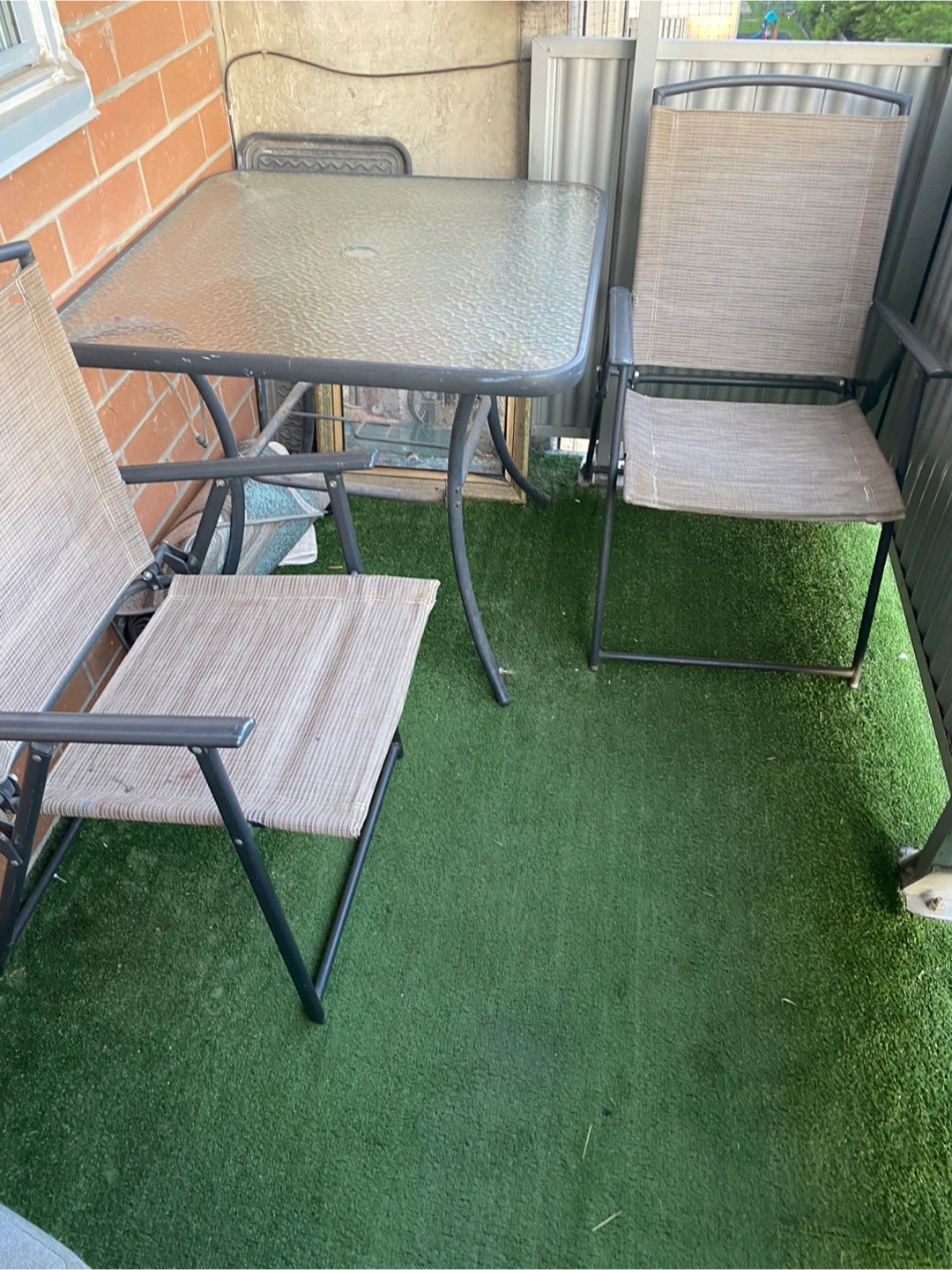 -614Selling a patio table and chairs set, perfect for enjoying the outdoors! The set includes a table with a glass top and 2 matching chairs. It's in good condition and ready to be used on your balcony or patio