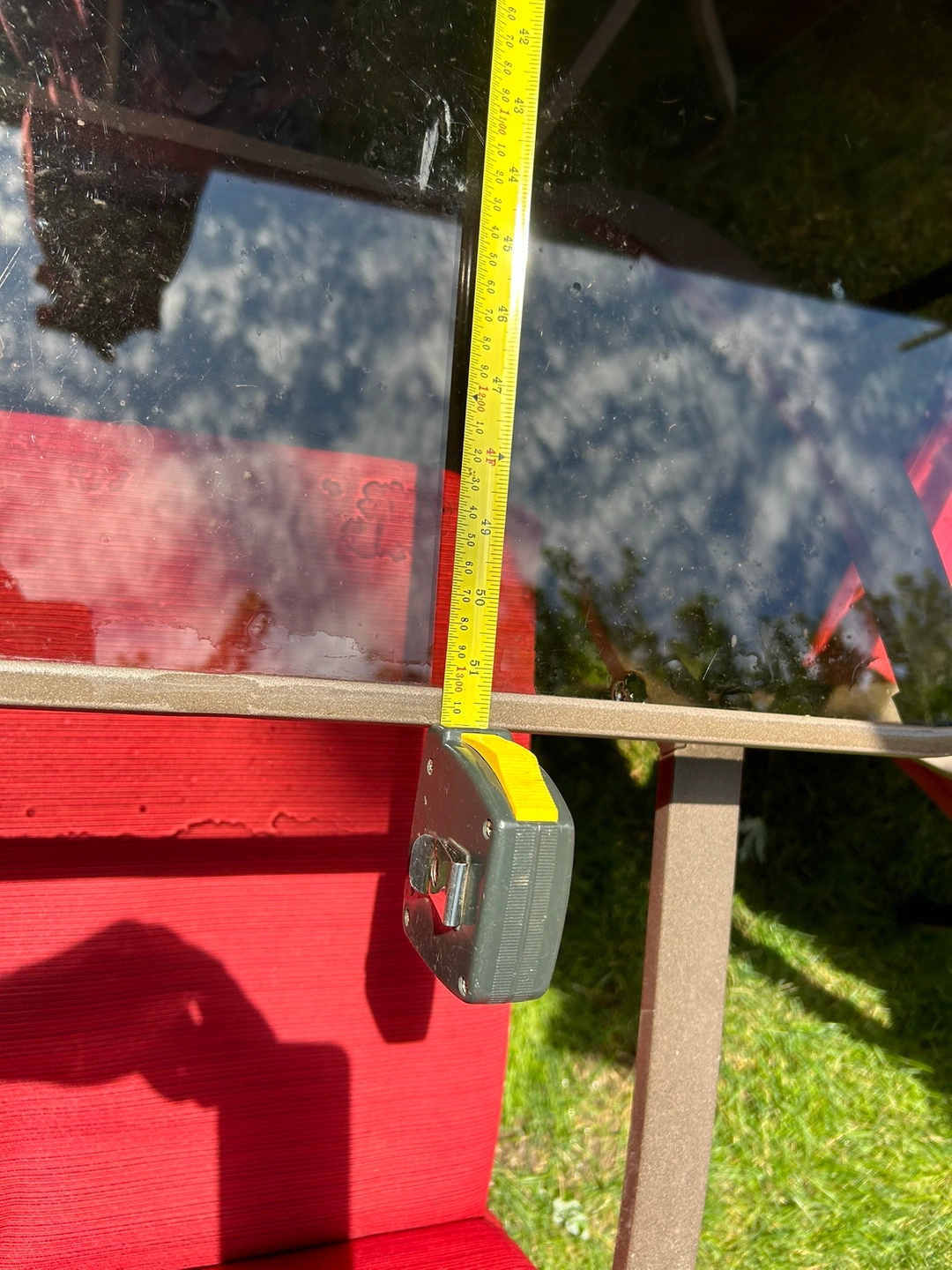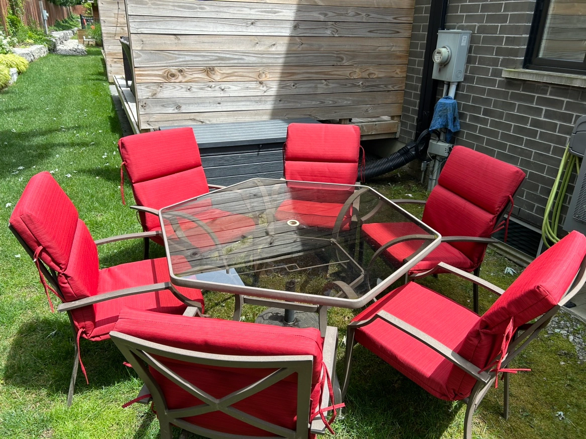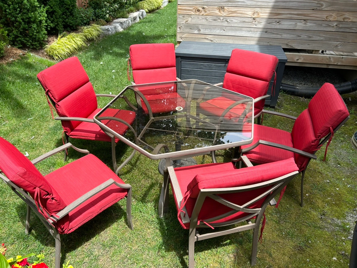 5One - hexagonal glass top table, 52”; Six - hi-back chairs; Six - outdoor chair cushions (red) All in good condition, cushions are newer easy care outdoor fabric. Comfortably seats six adults for outdoor dining. Pickup Only - NO DELIVERY!