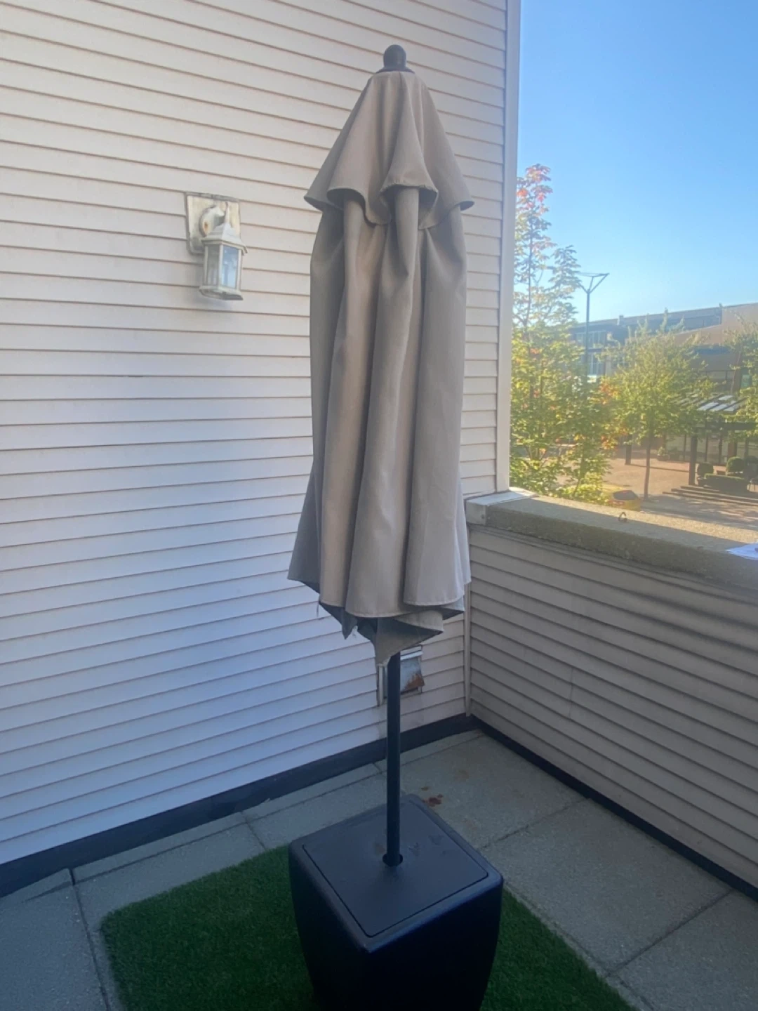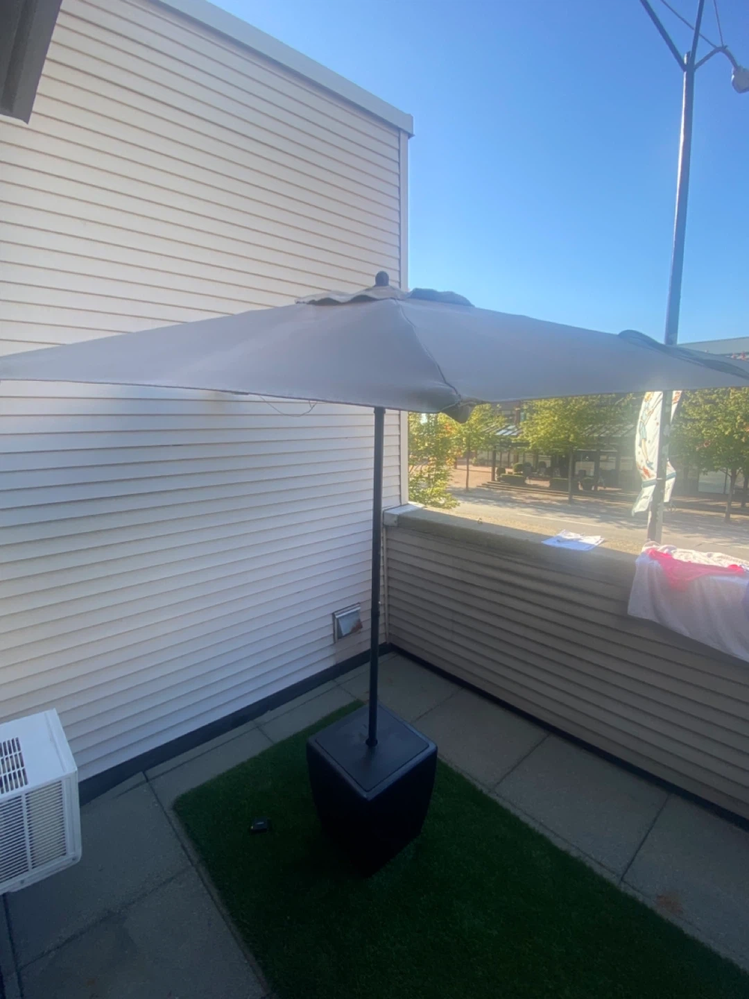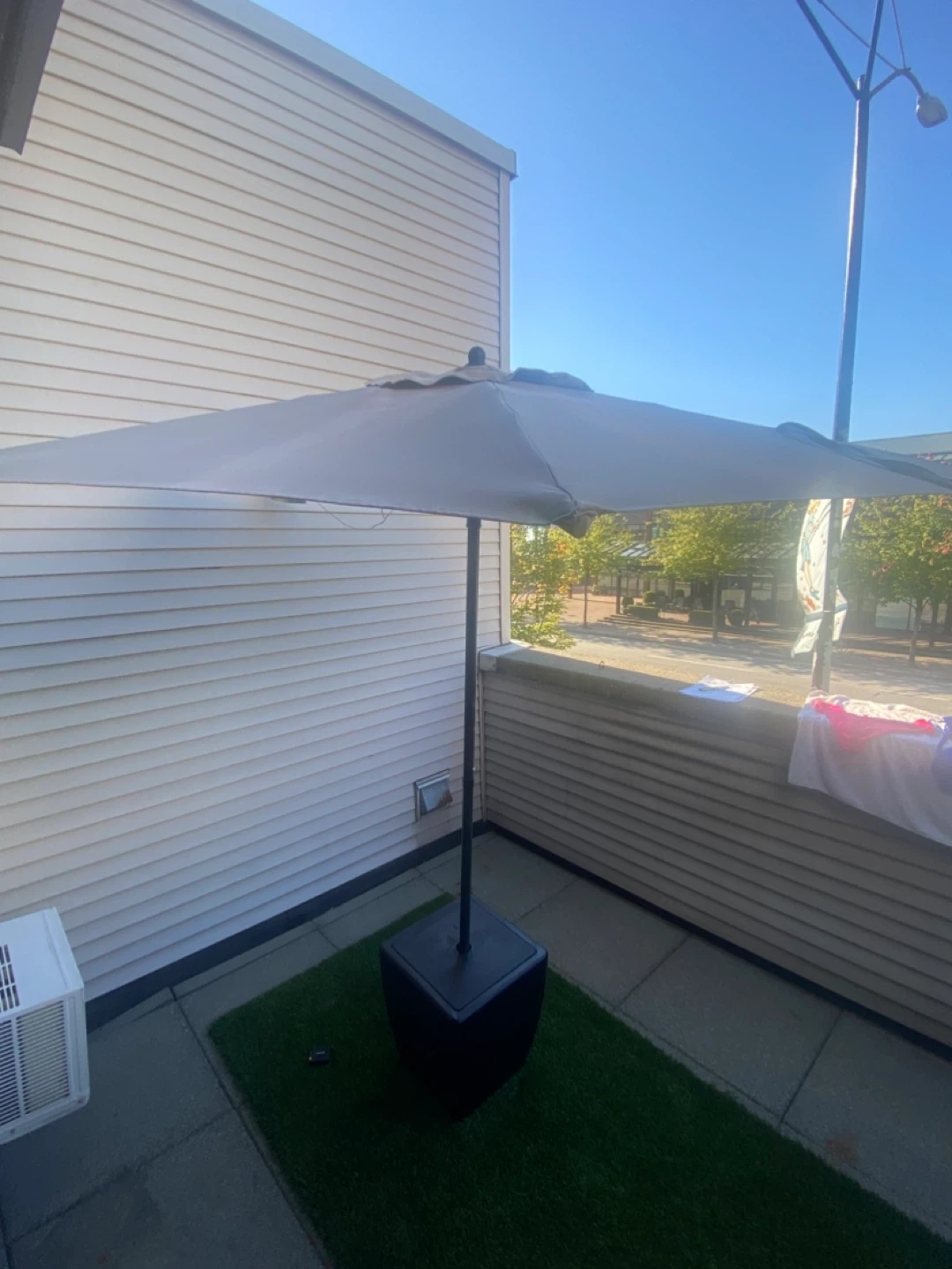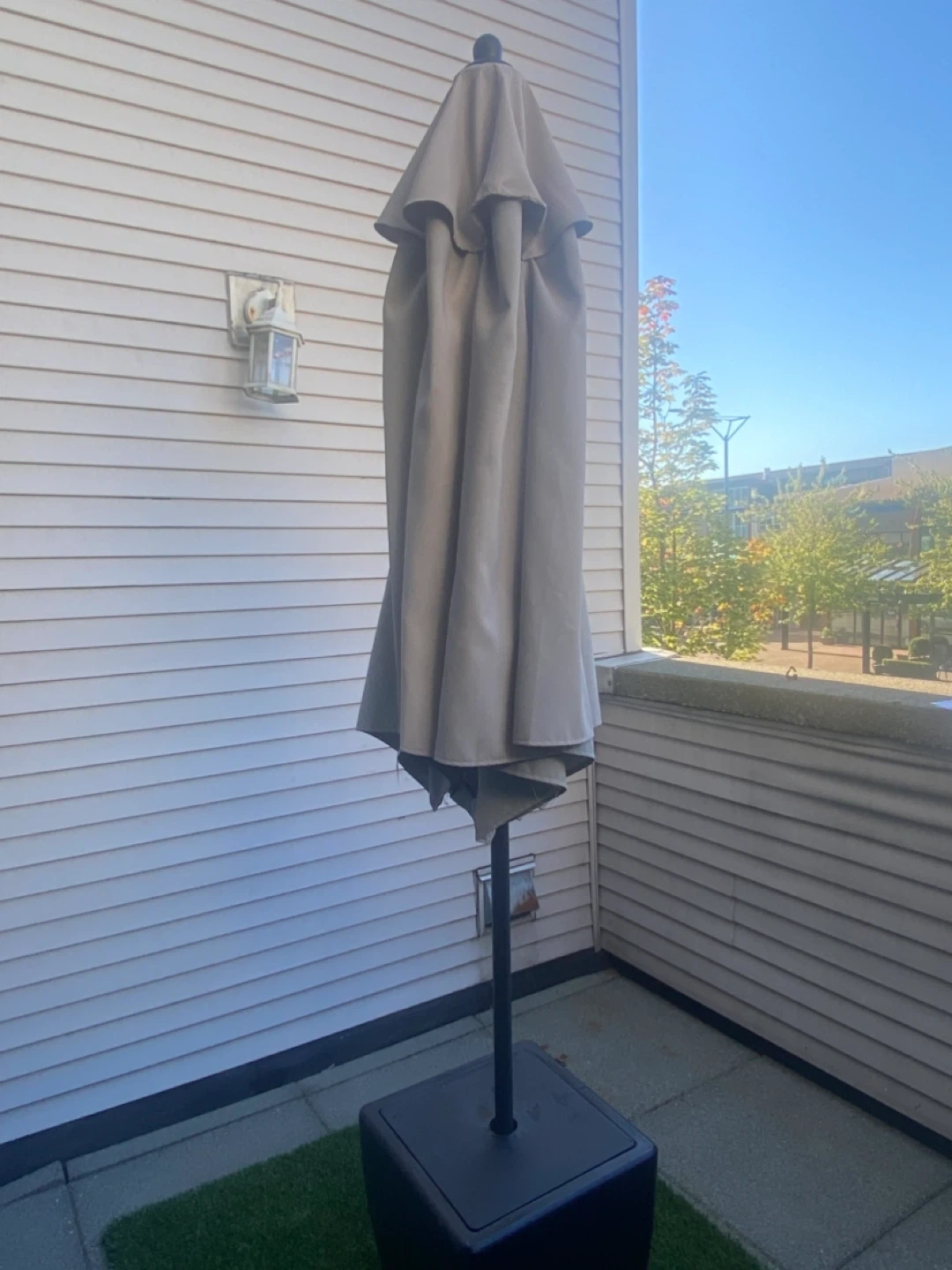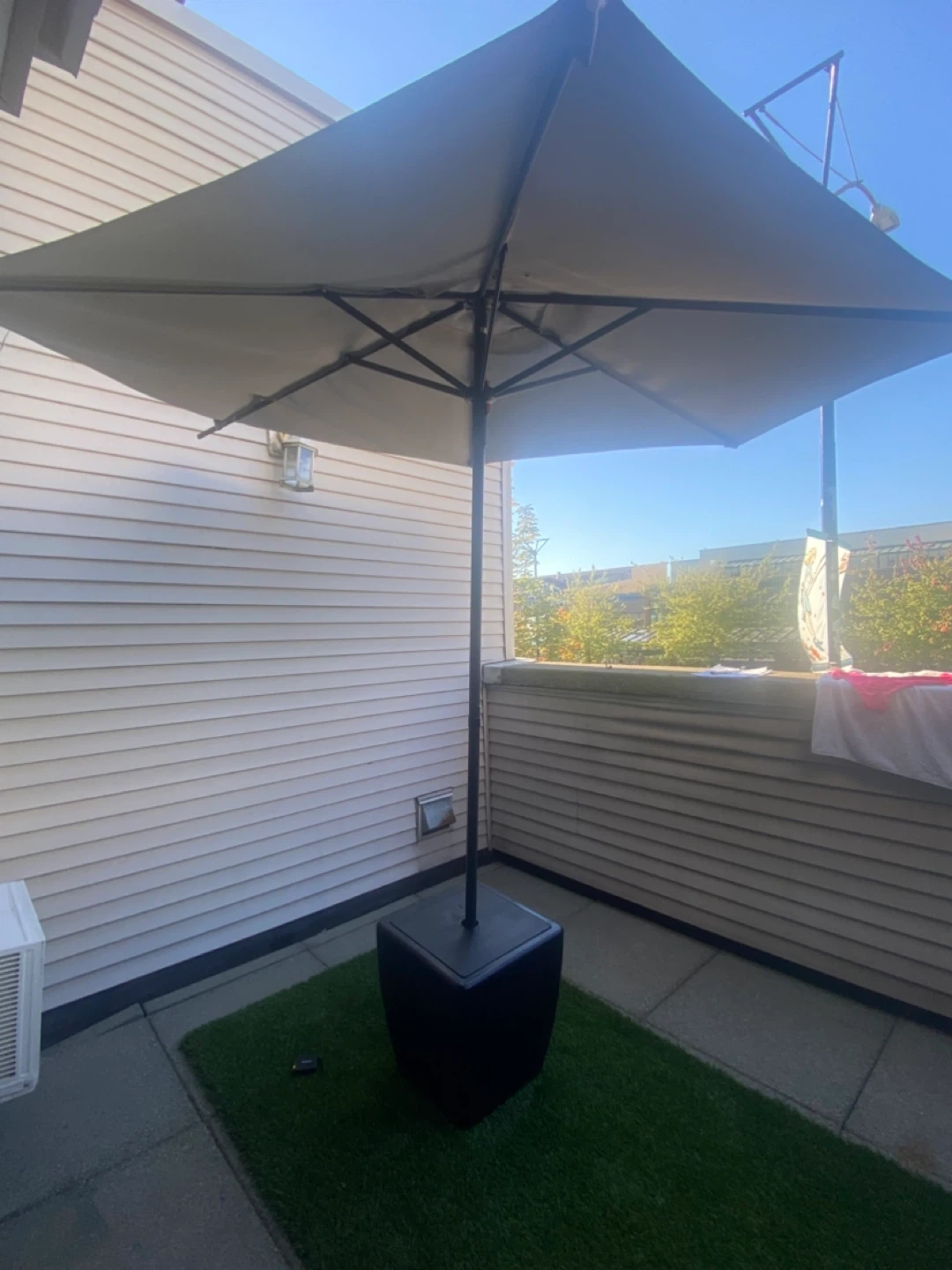 Selling a patio umbrella with its base. It's in great condition and ready to provide some shade for your outdoor space. Perfect for enjoying those sunny days without getting too much sun! The base is included, so it's all set for easy setup. Pick up only. 86” x 88”.