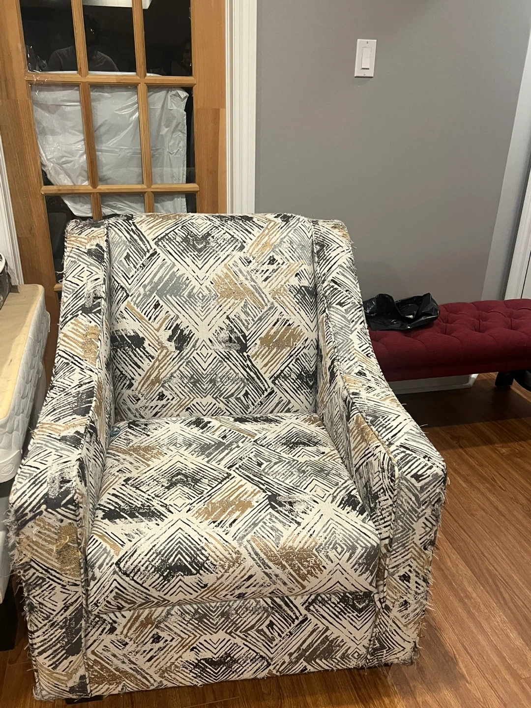 Selling a comfy armchair with a unique pattern! It's perfect for adding a touch of style to your living room or any cozy corner in your home. The chair shows some signs of wear, but it's still sturdy and ready to be enjoyed. It features a mix of neutral colours, making it easy to match with your existing decor. A great addition to any home!