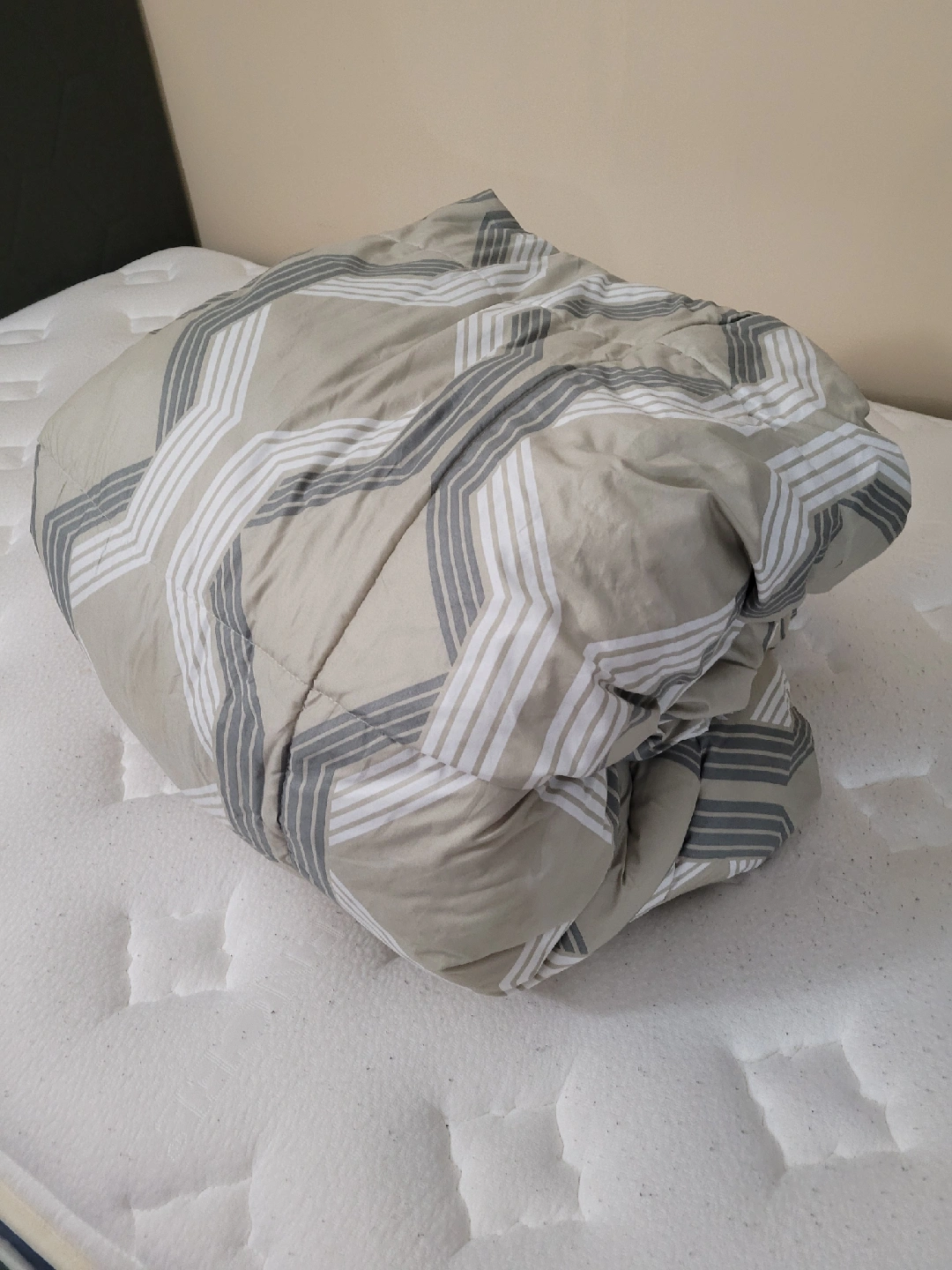 A FREE comforter with a geometric pattern in neutral tones. It's in good condition and would be a cozy addition to any bedroom!