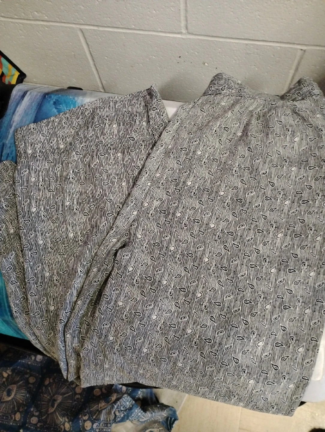 10Selling a pair of patterned grey pants. They're in great condition and ready for a new home!