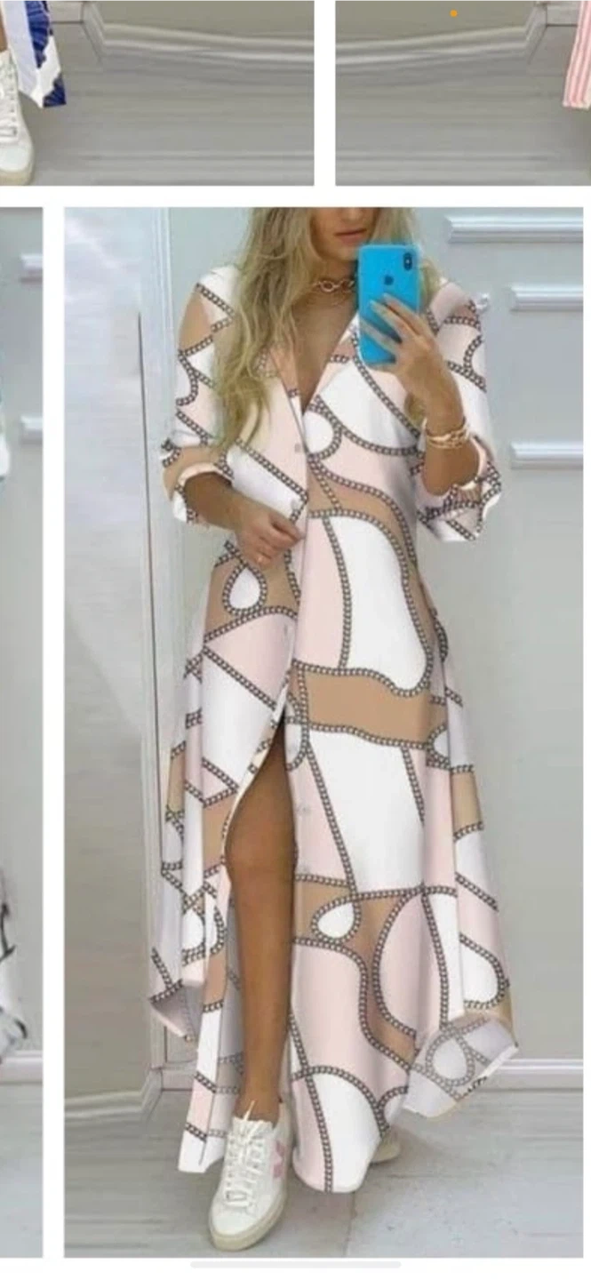 Beautiful maxi dress with a unique chain-like pattern in white, pink, and beige! It features a button-up front and a stylish slit. Perfect for a casual day out or a special occasion