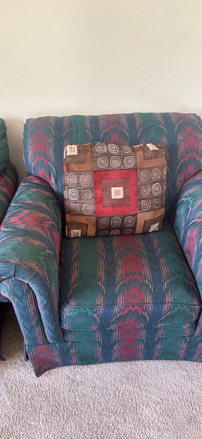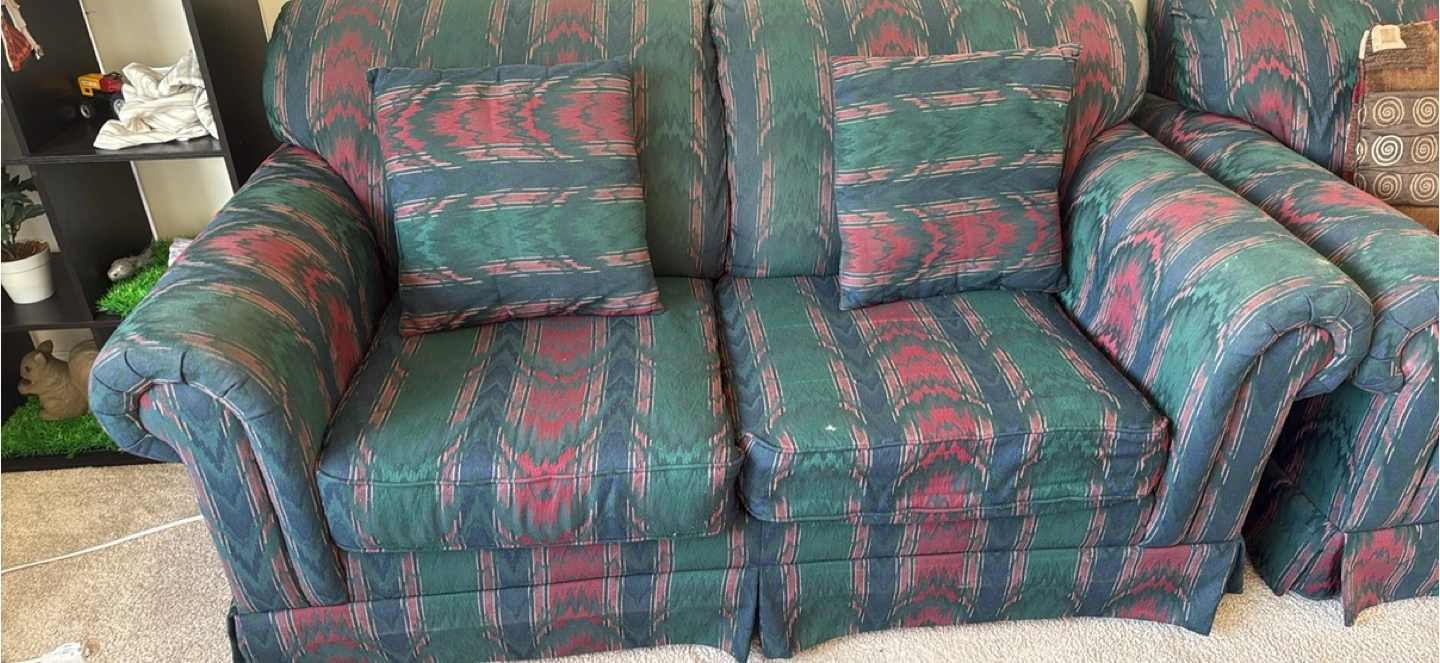 Selling a sofa and loveseat set with a unique patterned design. The set is in good condition and would be a cozy addition to any living room. Perfect for adding a touch of character to your home!