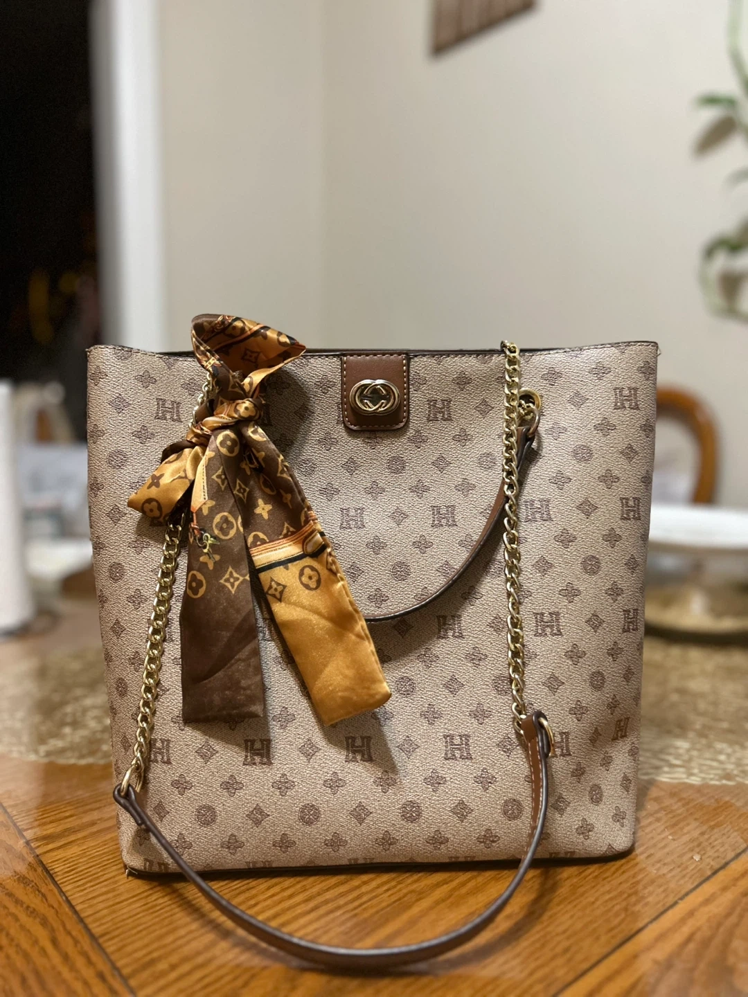 68A stylish tote bag featuring a unique pattern and a decorative scarf! The bag has gold-tone chain details and a comfortable shoulder strap. It's in great condition and ready for a new home Purchase price-490$
