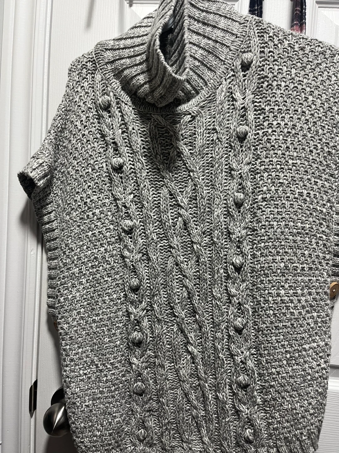 Grey sleeveless turtleneck vest with cable knit detailing and decorative buttons. It's made from a textured knit fabric. This vest is great for layering on cooler days.