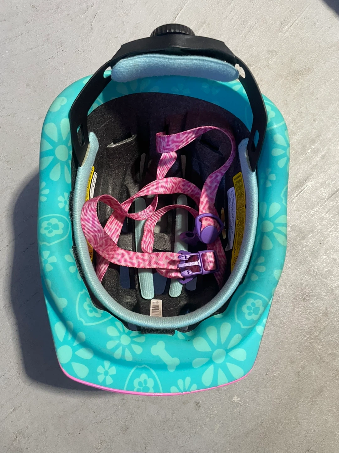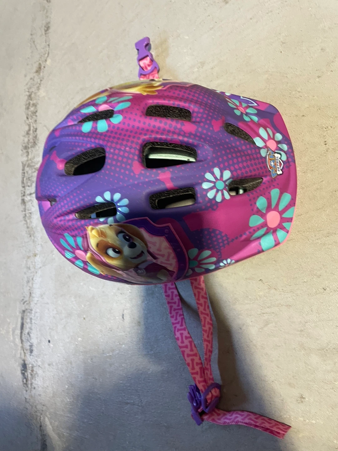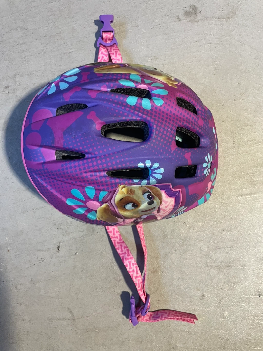 12Paw Patrol Skye themed bike helmet for kids! It's in great shape and ready for a new adventurer. Features a fun purple and pink design with Skye from Paw Patrol. Perfect for biking, skating, or scootering! It’s for age under 7 years old.