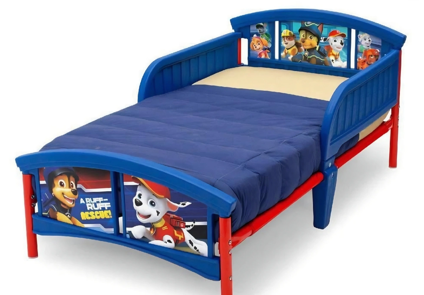 10Paw Patrol toddler bed in great condition! Perfect for transitioning your little one from a crib to a bed. Features a fun Paw Patrol design with Chase and Marshall on the side panels and the whole gang on the headboard. The frame is blue and red. Mattress included