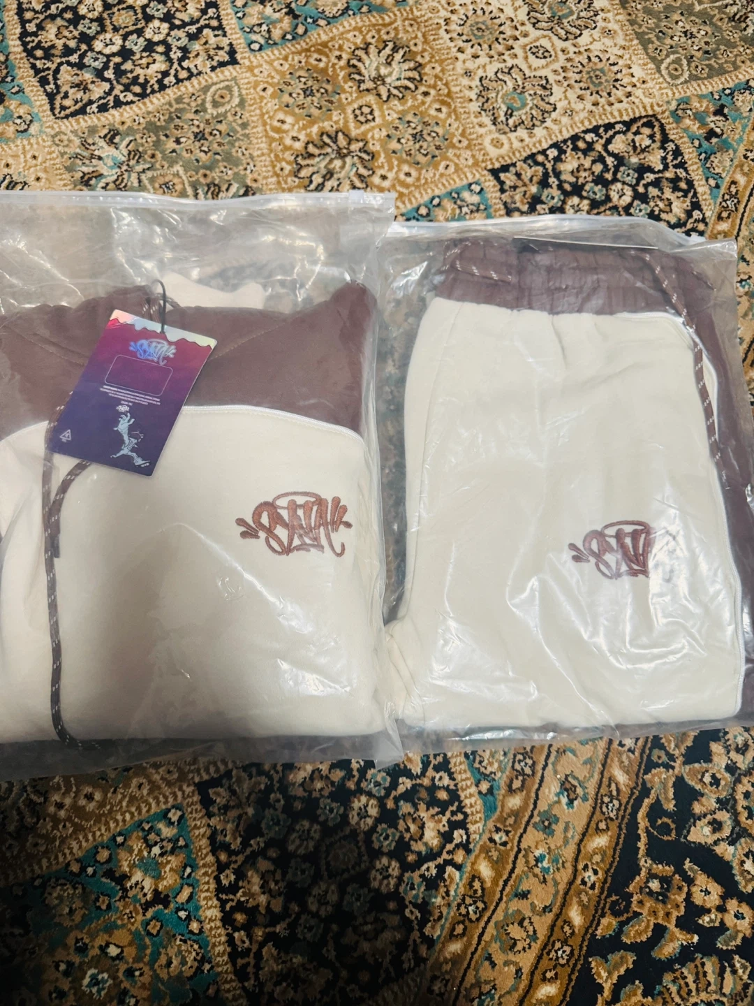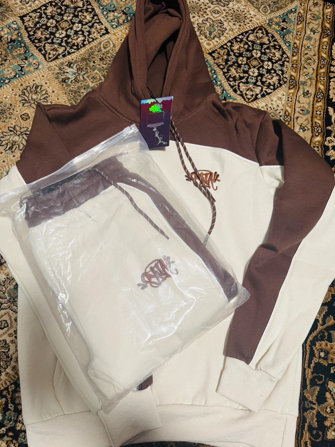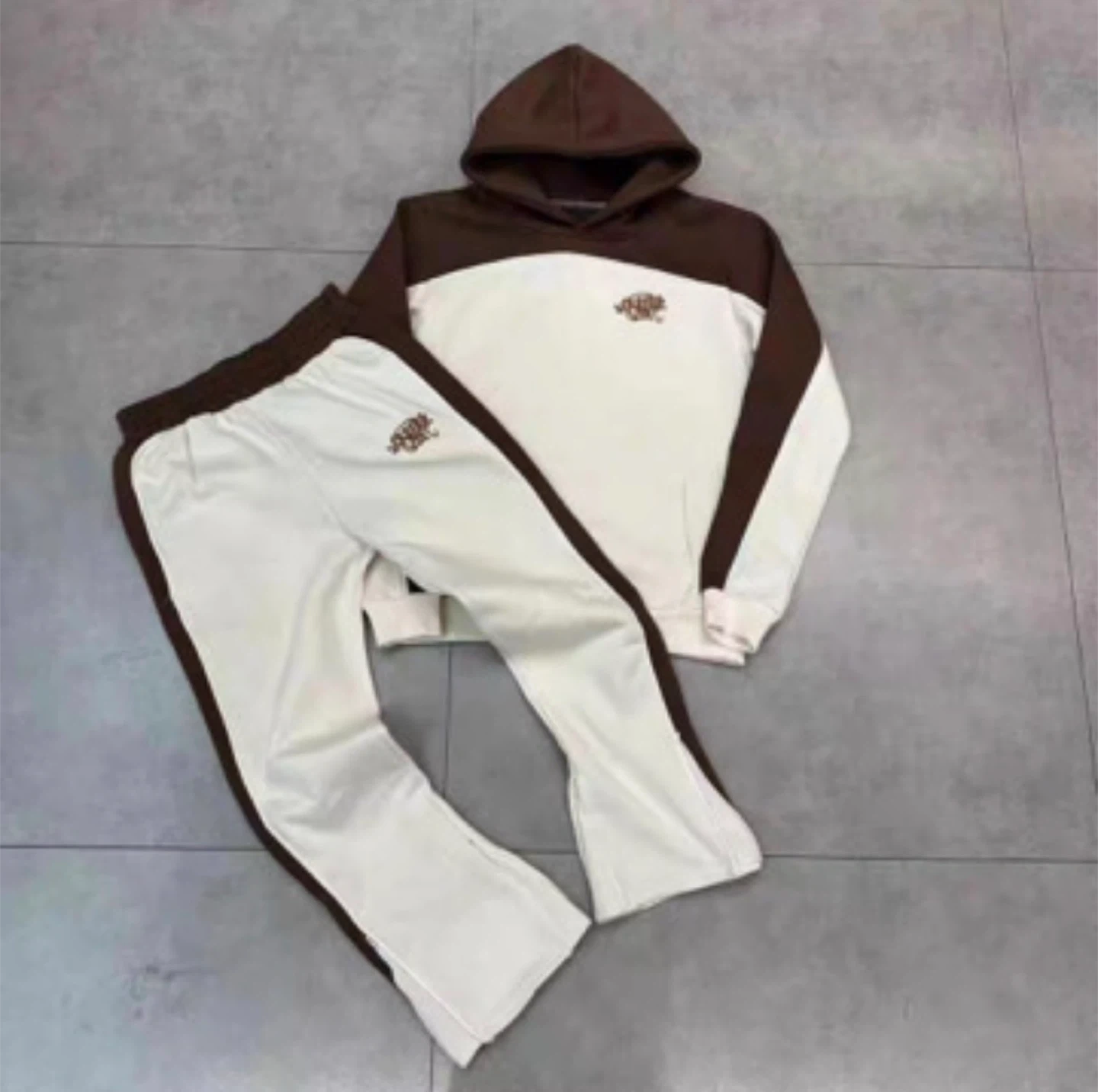 This set includes a colour-blocked hoodie and matching pants. Both pieces feature embroidered detailing. It's made for comfort and casual wear.