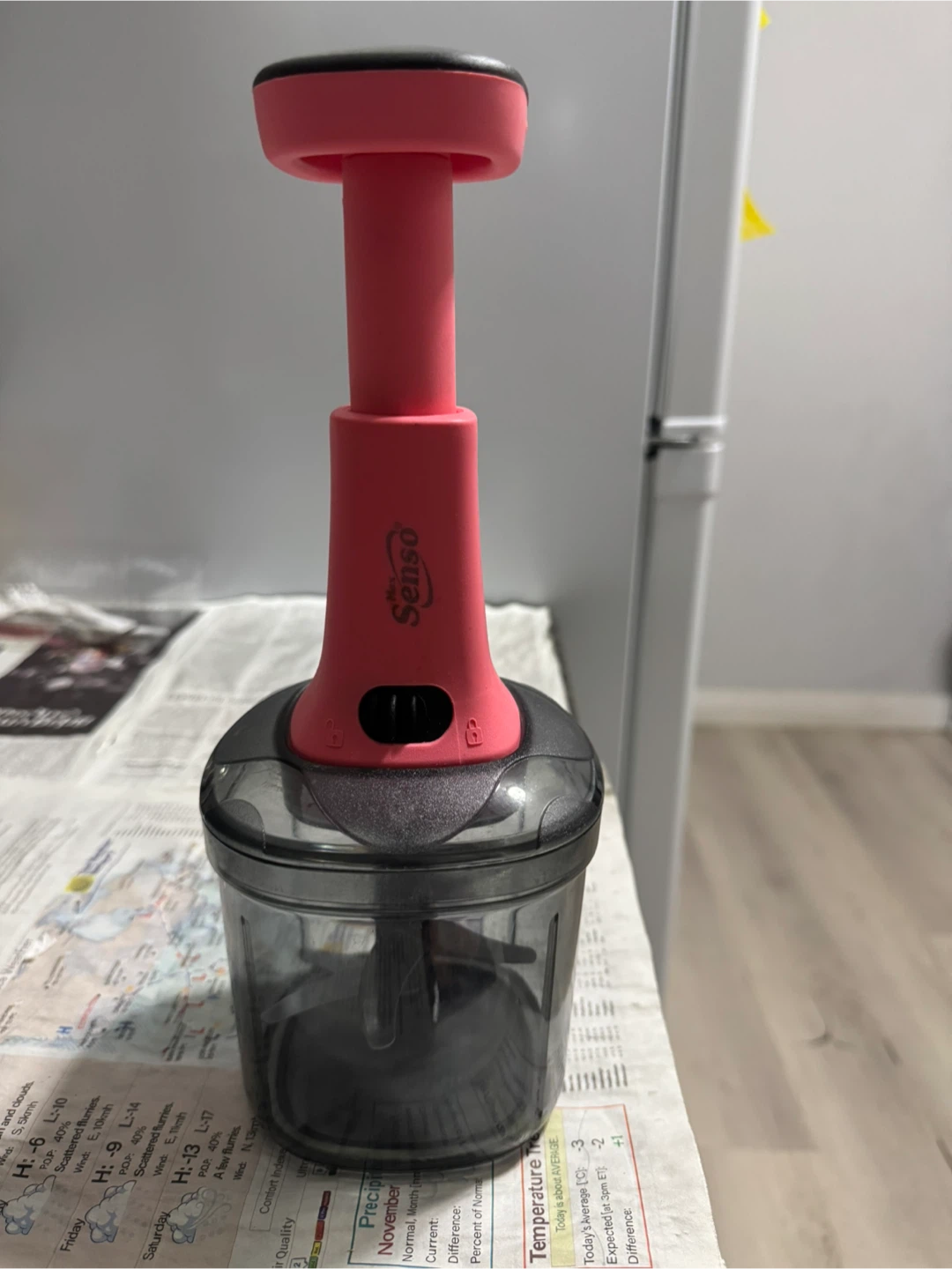 This professional manual food chopper is great for quickly mincing herbs and vegetables. It's simple to use, just pull the cord to activate the blades. The clear container lets you see your progress.
