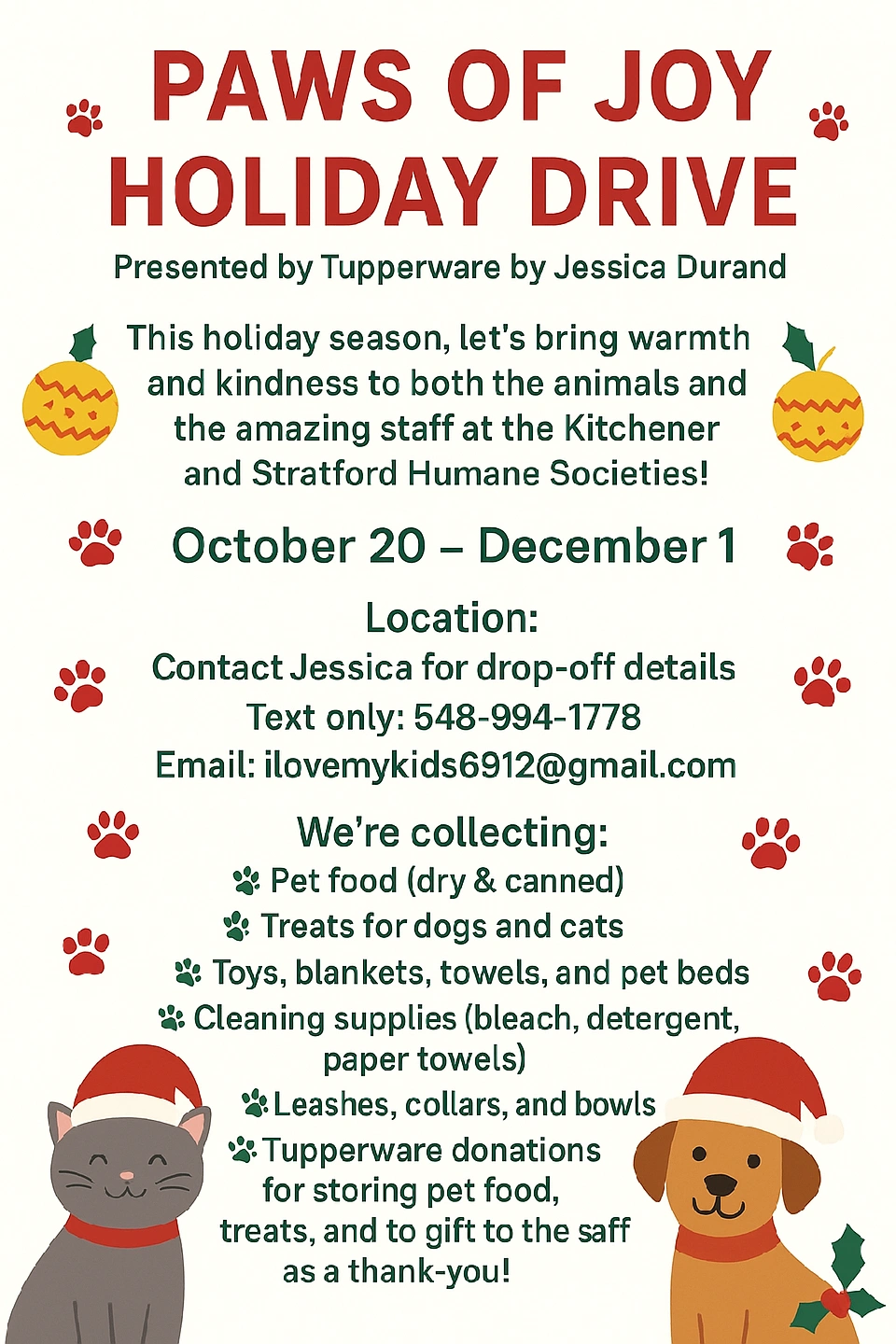 Ok everyone I have exciting news the humain society in Kitchener and Stratford has accepted my drive! So let get this drive rolling! Ways to support: 1. Donate 2.share 3. Word of mouth in the community 🐾 Paws of Joy Holiday Drive! 🎄 Presented by Tupperware by Jessica Durand This holiday season, let’s bring warmth and kindness to both the animals and the amazing staff at the Kitchener and Stratford Humane Societies! ❤️ From Oct 20 – Dec 1, we’re collecting: 🐶 Pet food (dry & canned) 🐱 Treats for dogs & cats 🧸 Toys, blankets, towels, and beds 🧽 Cleaning supplies (bleach, detergent, paper towels) 🦴 Leashes, collars, and bowls 🎁 Gifts and goodies for staff – self-care items, snacks, gift cards, and small surprises 🫙 Tupperware donations for storing pet food, treats, and to gift to the staff as a thank-you! 📱 Text: 548-994-1778 📧 Email: ilovemykids6912@gmail.com Let’s show love to the animals and the incredible people who care for them every day. 🐾💚 #PawsOfJoy #TupperwareCares #HolidayDrive #SupportLocalShelters #Kitchener #Stratford #ThankYouShelterStaff