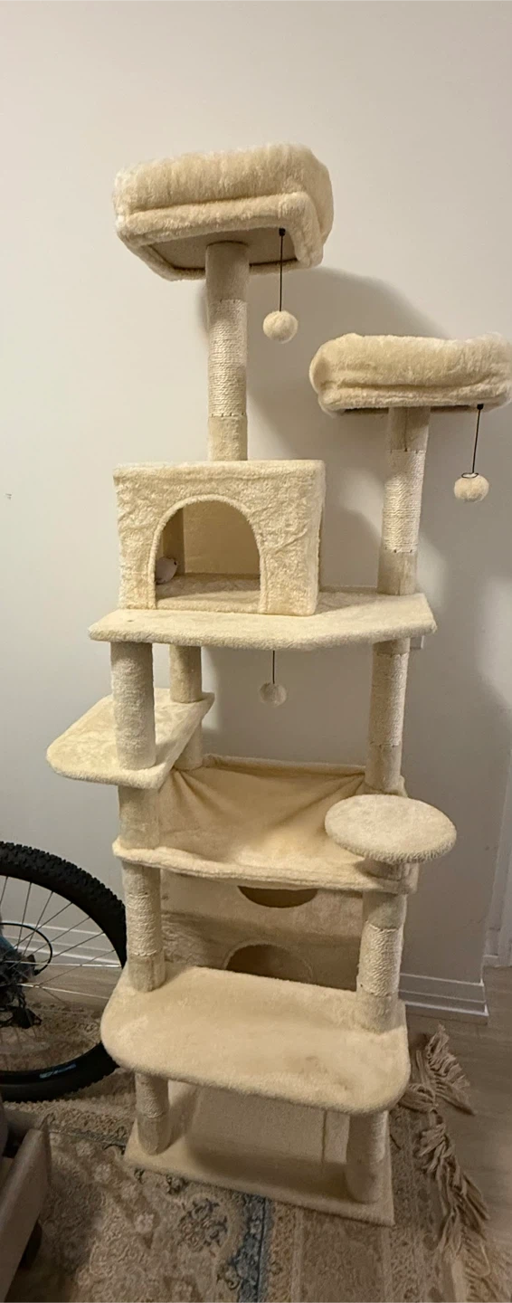 Bought this for my very senior cat, but she refuses to use it as she’s hated these things since she was 7 weeks old. It’s basically brand new, fully assembled, and just collecting dust the last month. Details: • 72” tall with two condos, two top perches, hammock, and scratching posts • Super sturdy and covered in soft beige faux fur • Great for multi-cat homes or active cats • From a smoke-free home, spotless and unused Pickup near Yonge & Eglinton.