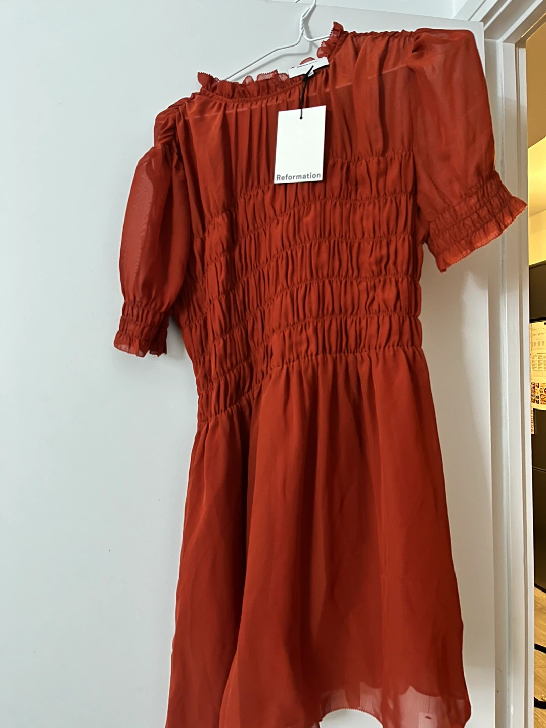 Here's a lovely red dress from Reformation! It's in brand new condition, never worn and ready for a new owner. The dress features a smocked bodice and short sleeves, perfect for a stylish and comfortable look