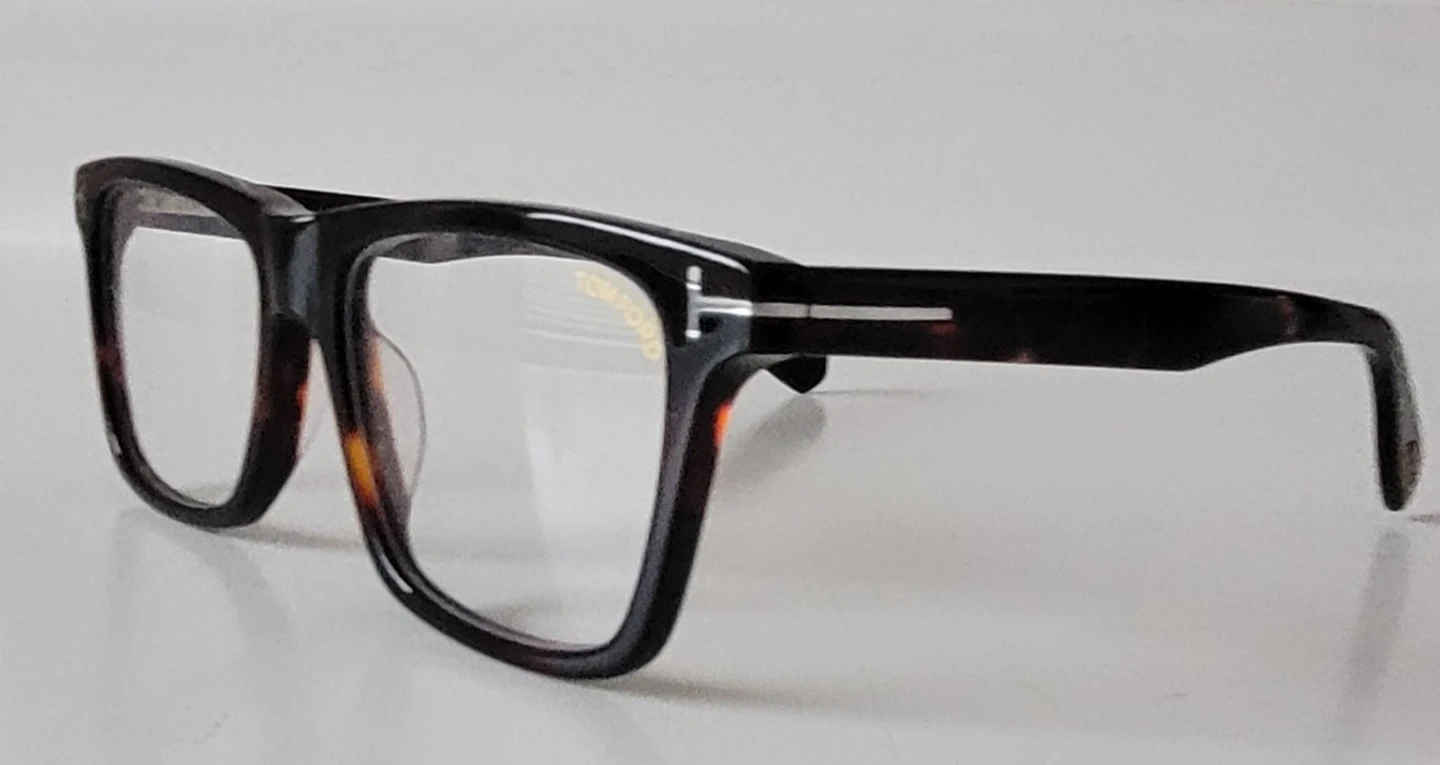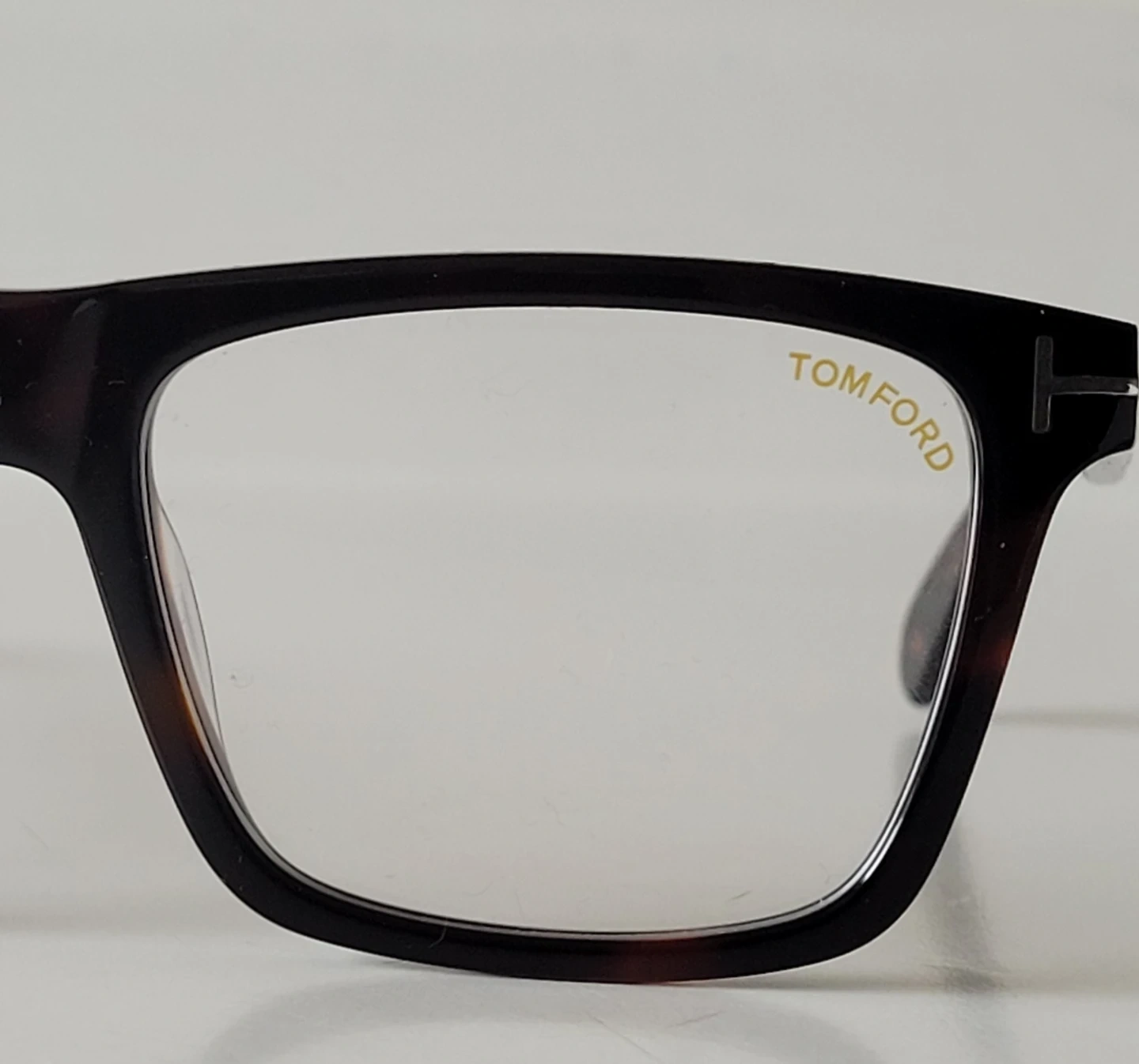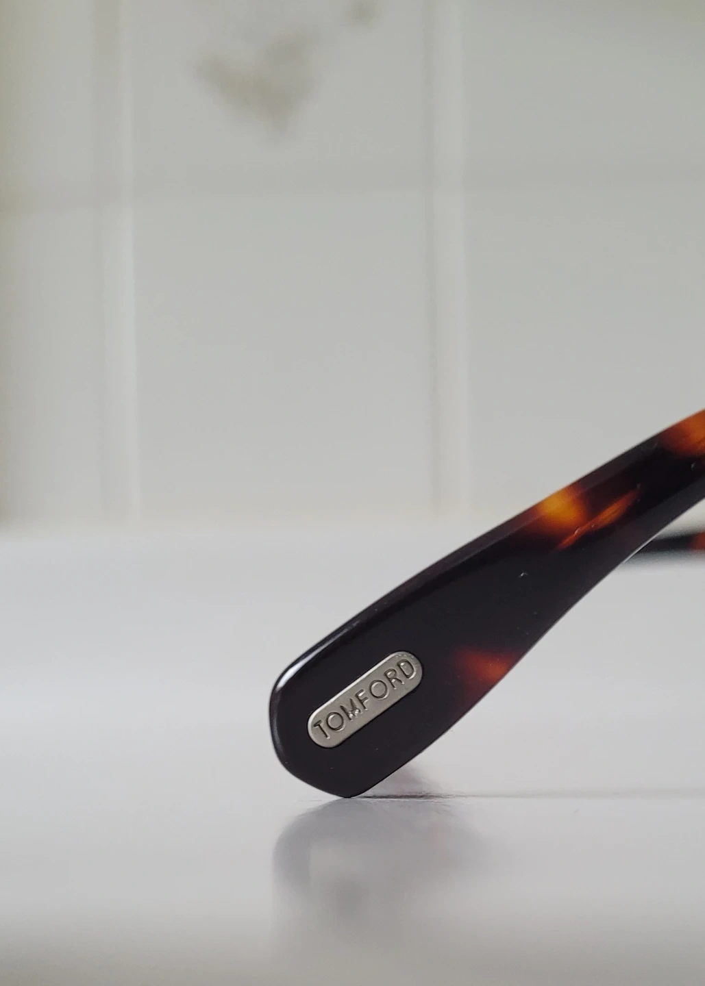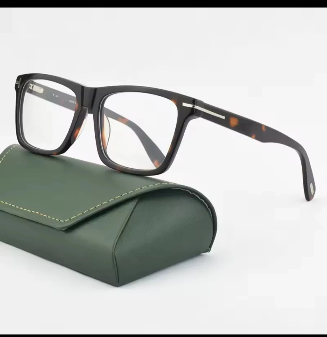 Tortoiseshell Tom Ford eyeglasses with a classic square frame. Includes the original green protective case. Made in Italy.