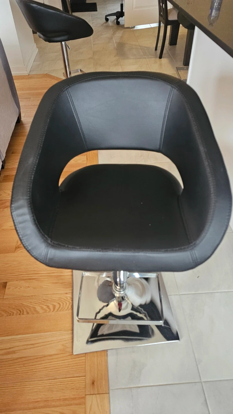 This is a black swivel bar stool with a faux leather seat and a chrome base. It's height adjustable for your convenience. This stool would be great for a kitchen island or home bar! I have 3 off them