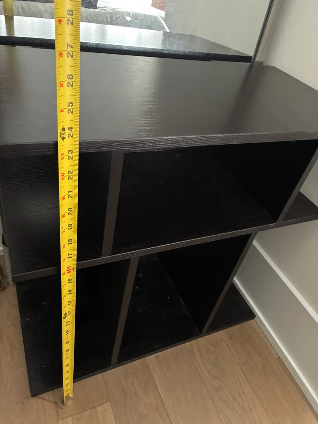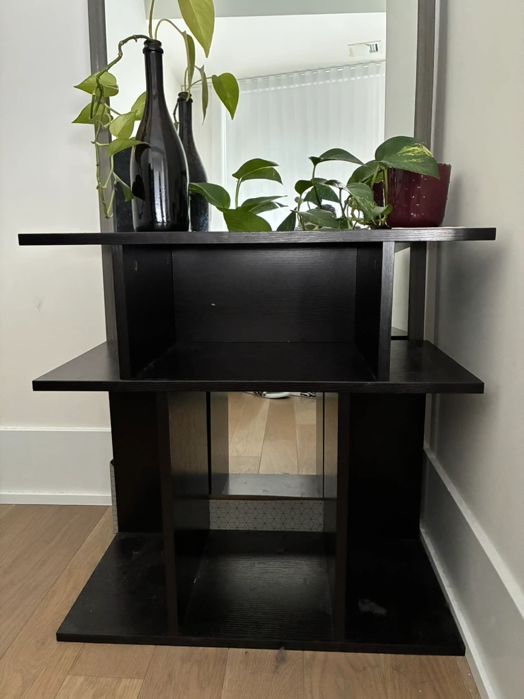 A black 6-shelf display shelf with wood grain finish. This unit is great for displaying books, decor, or plants. It's a versatile piece for any room!