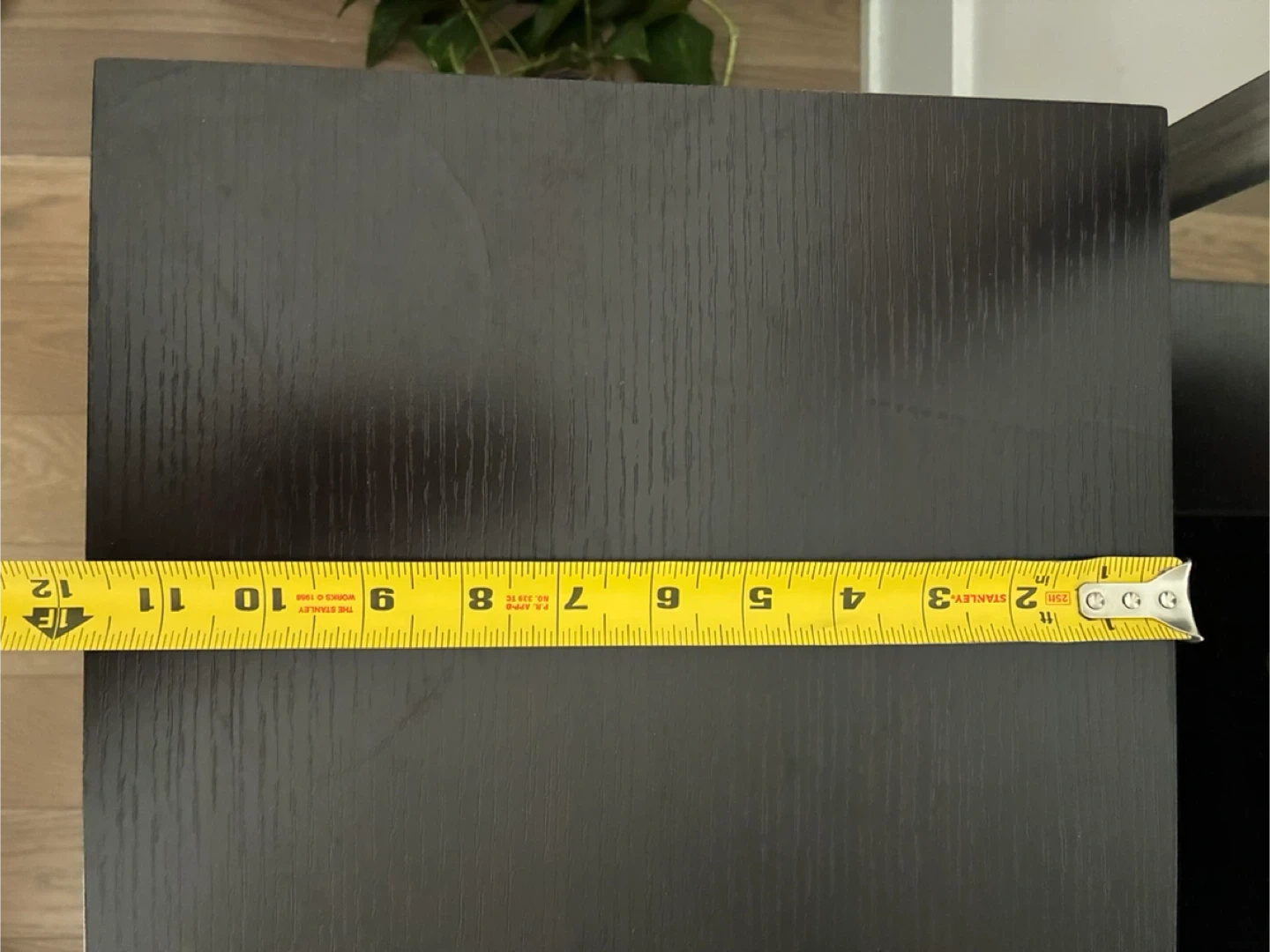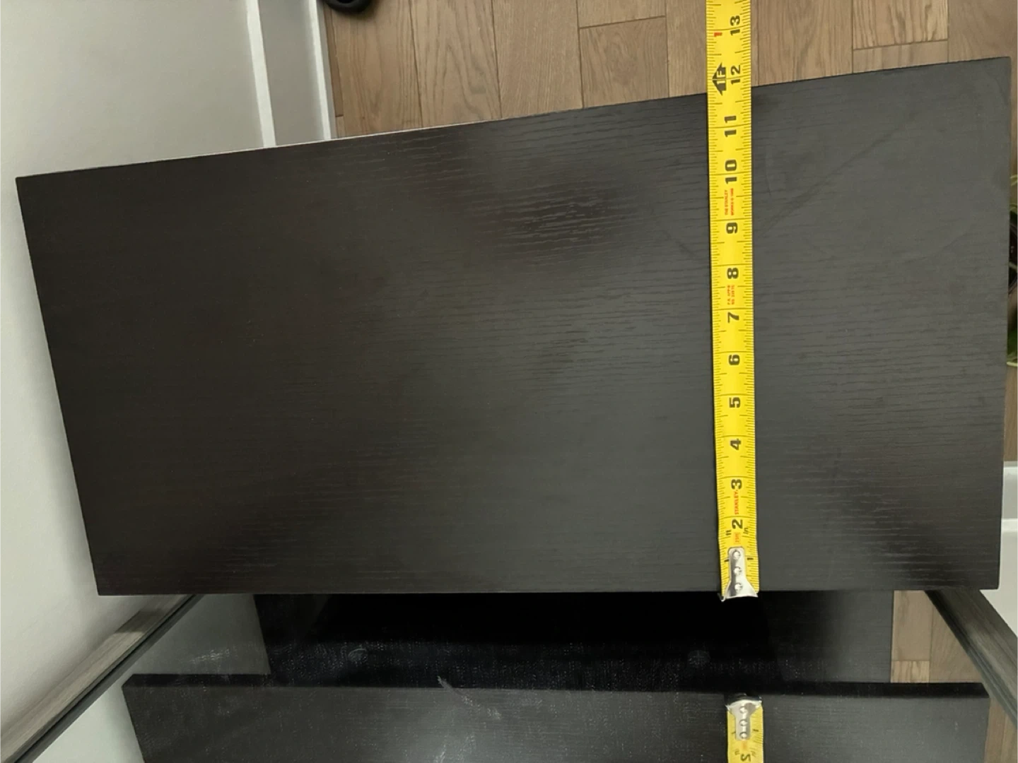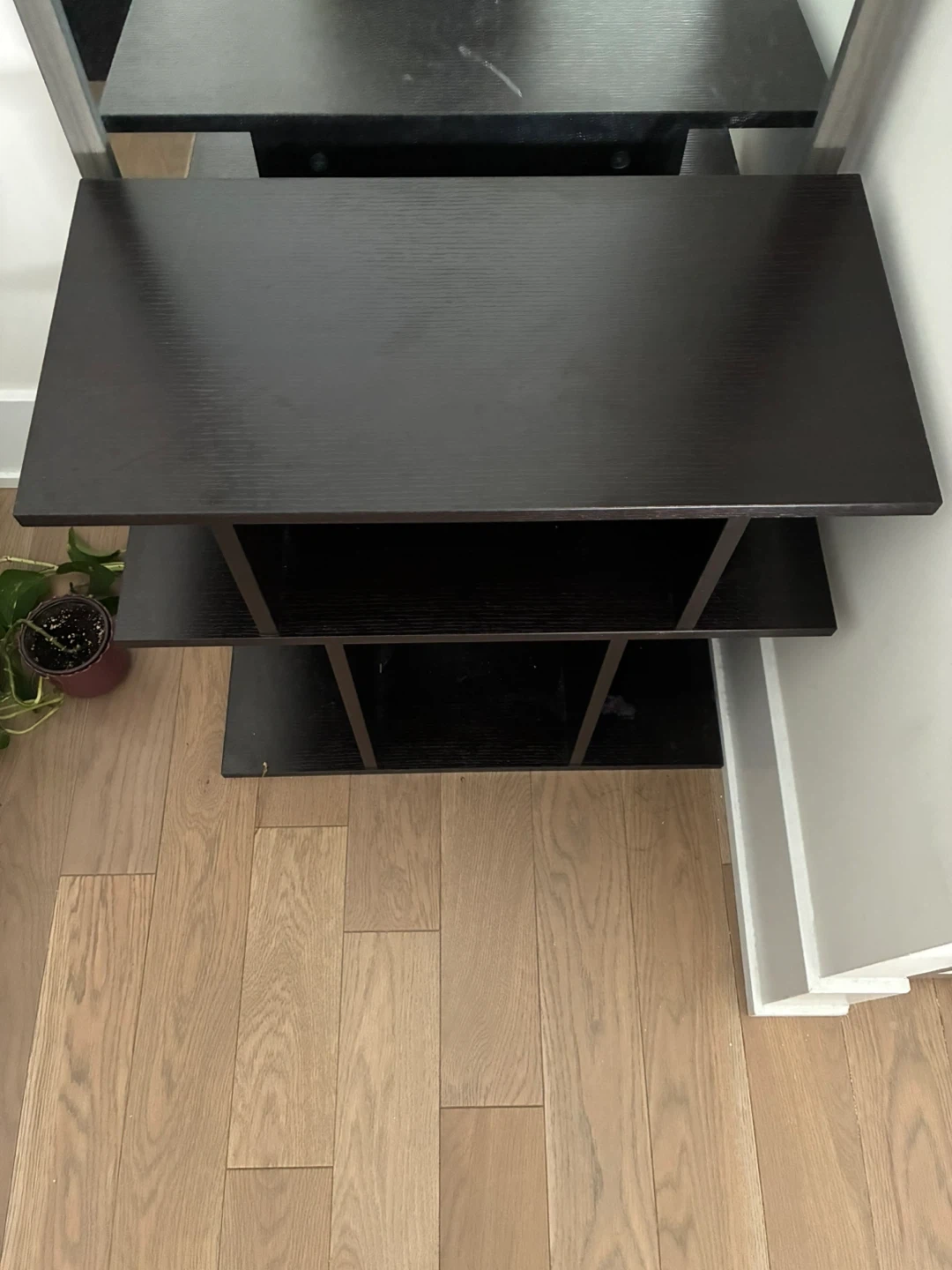 A black 6-shelf display shelf with wood grain finish. This unit is great for displaying books, decor, or plants. It's a versatile piece for any room!