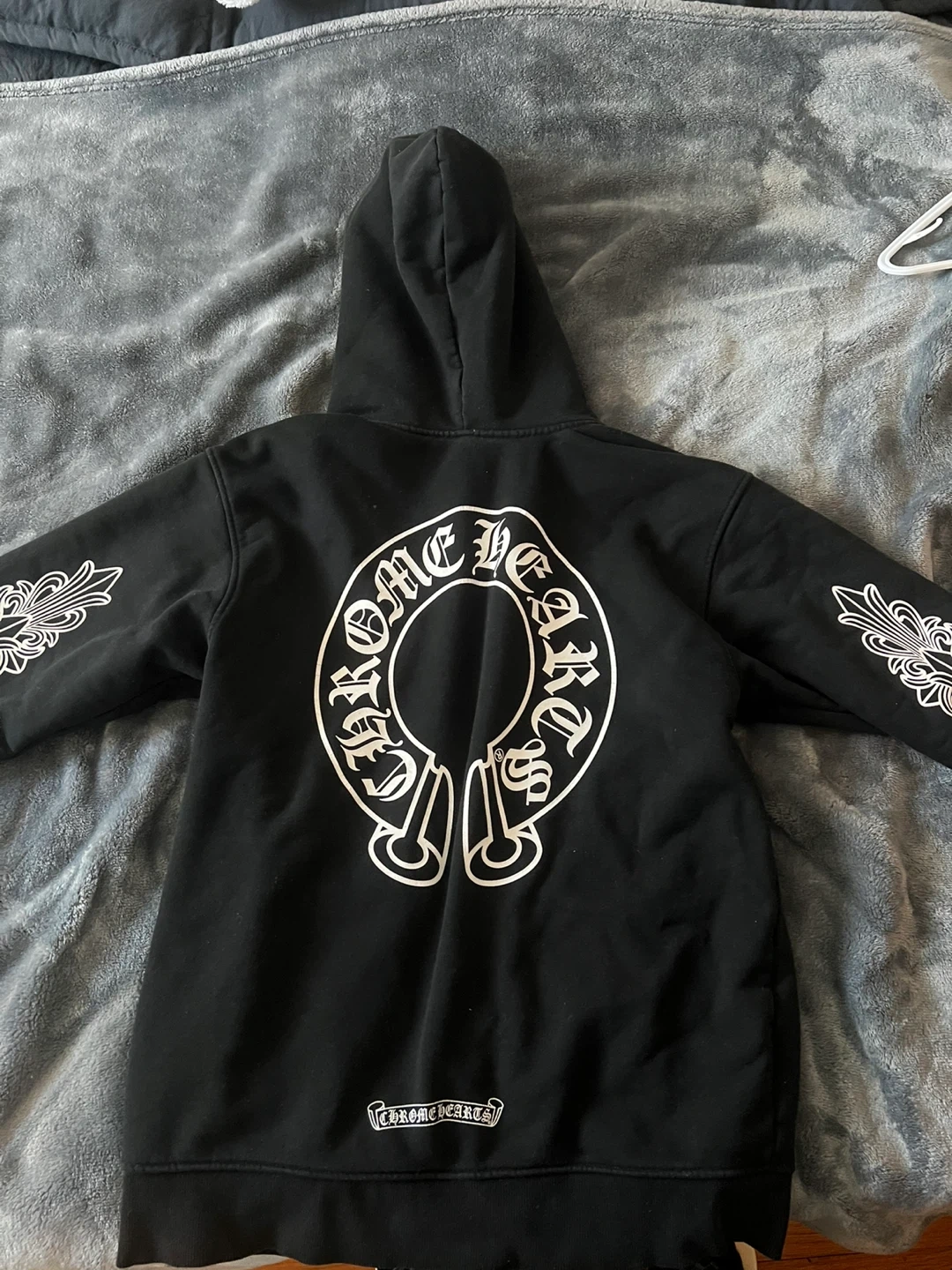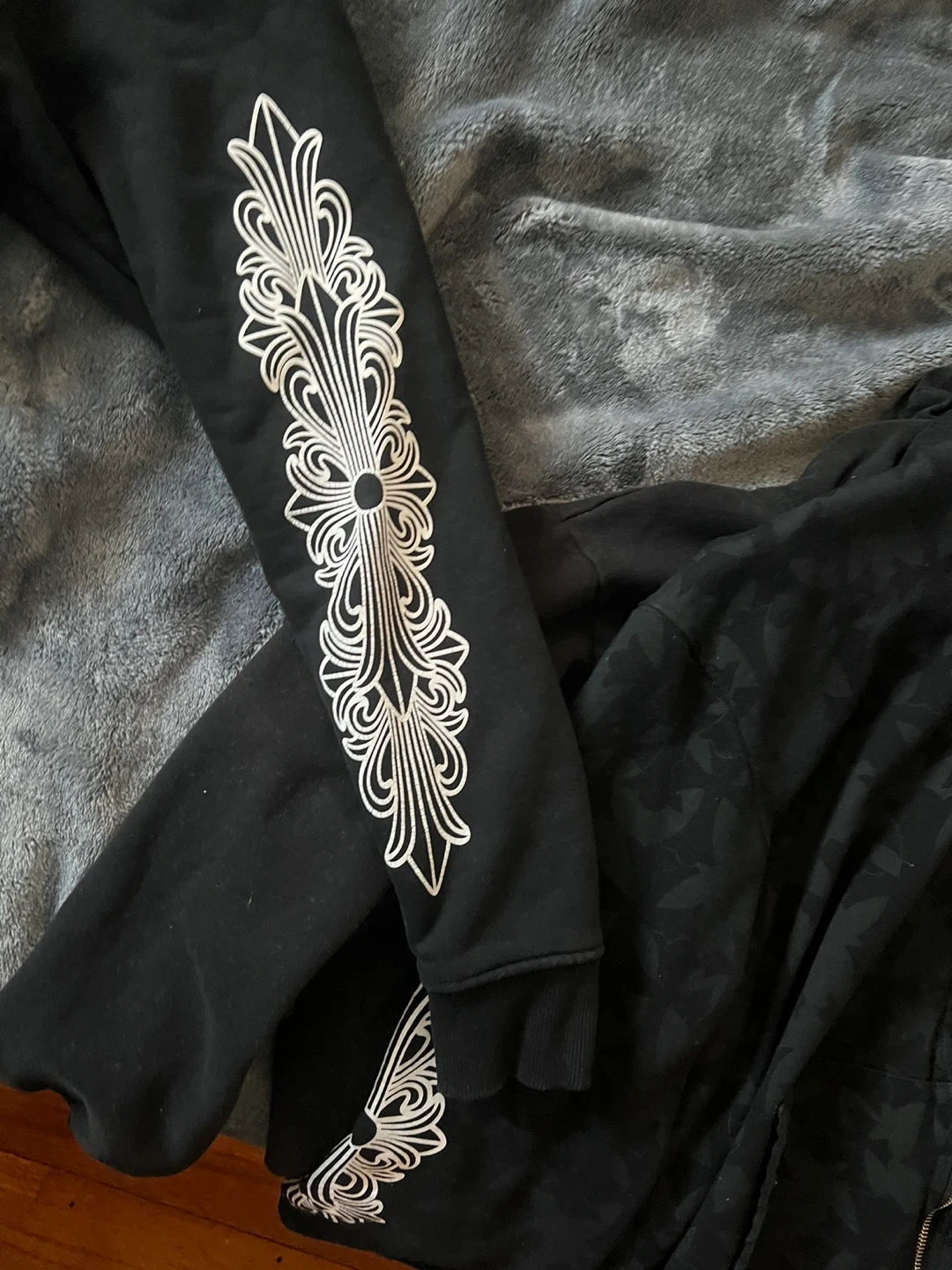 Classic black Chrome Hearts zip-up hoodie. Features the iconic circular logo on the back and decorative scrollwork on the sleeves. It's made from a comfortable cotton blend.