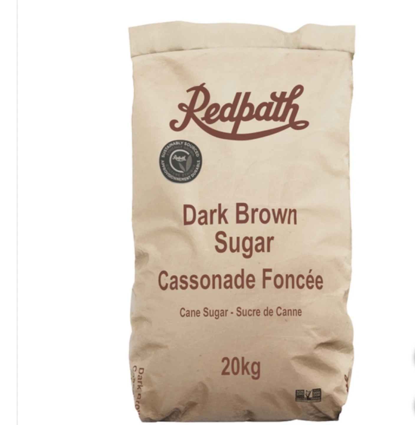 Bag of Redpath dark brown sugar. Cane sugar. This bag contains 20kg of sugar. Great for baking!