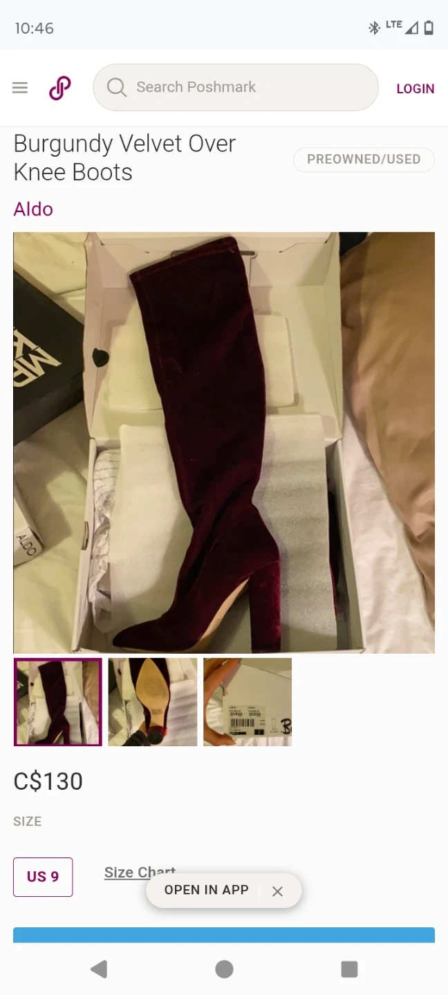 These Aldo boots are made of burgundy velvet. They're over the knee style with a block heel.